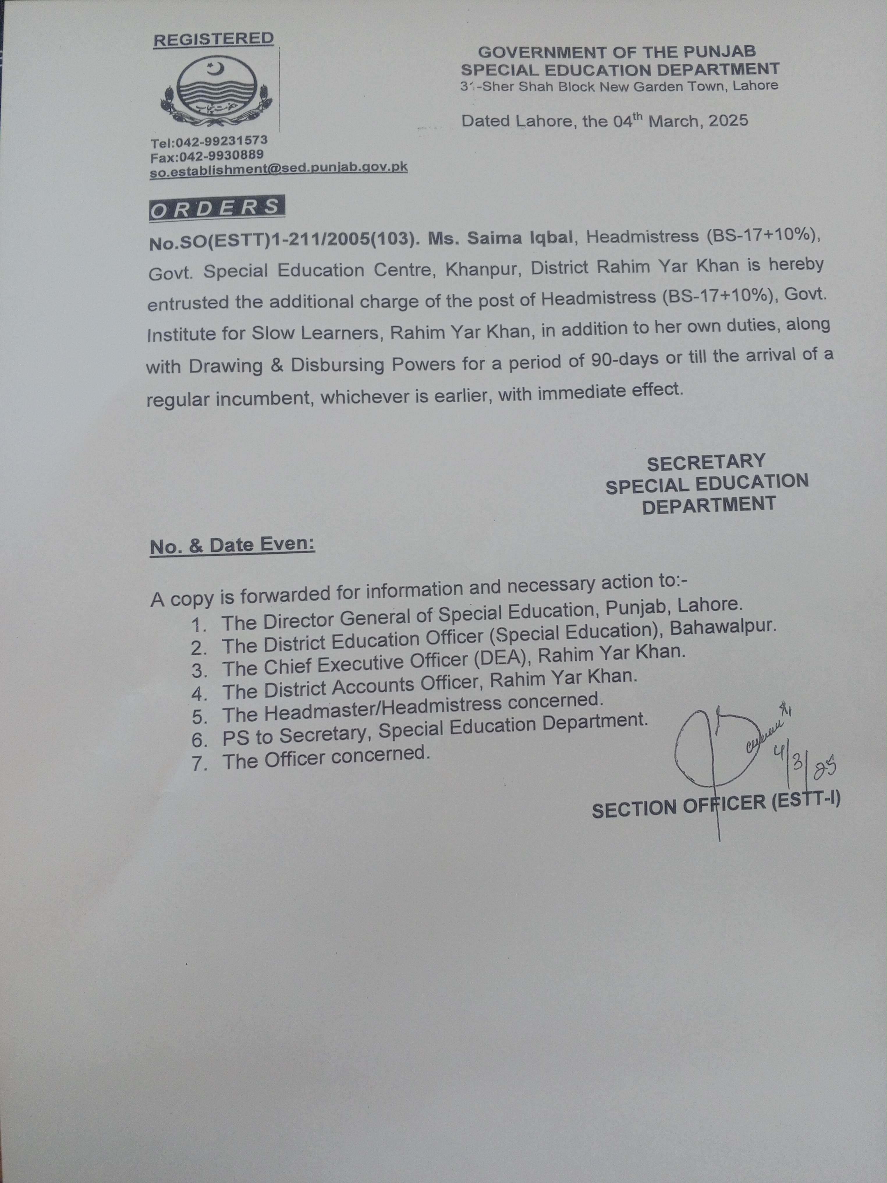 Category Additional Charge Orders Date Tuesday, March 4, 2025 - 12:00 Order No SO(ESTT.)1-211/2005 File 17410827574802659743042169742013.jpg3.4 MB Employee Name Saima Iqbal Prominent Notifications