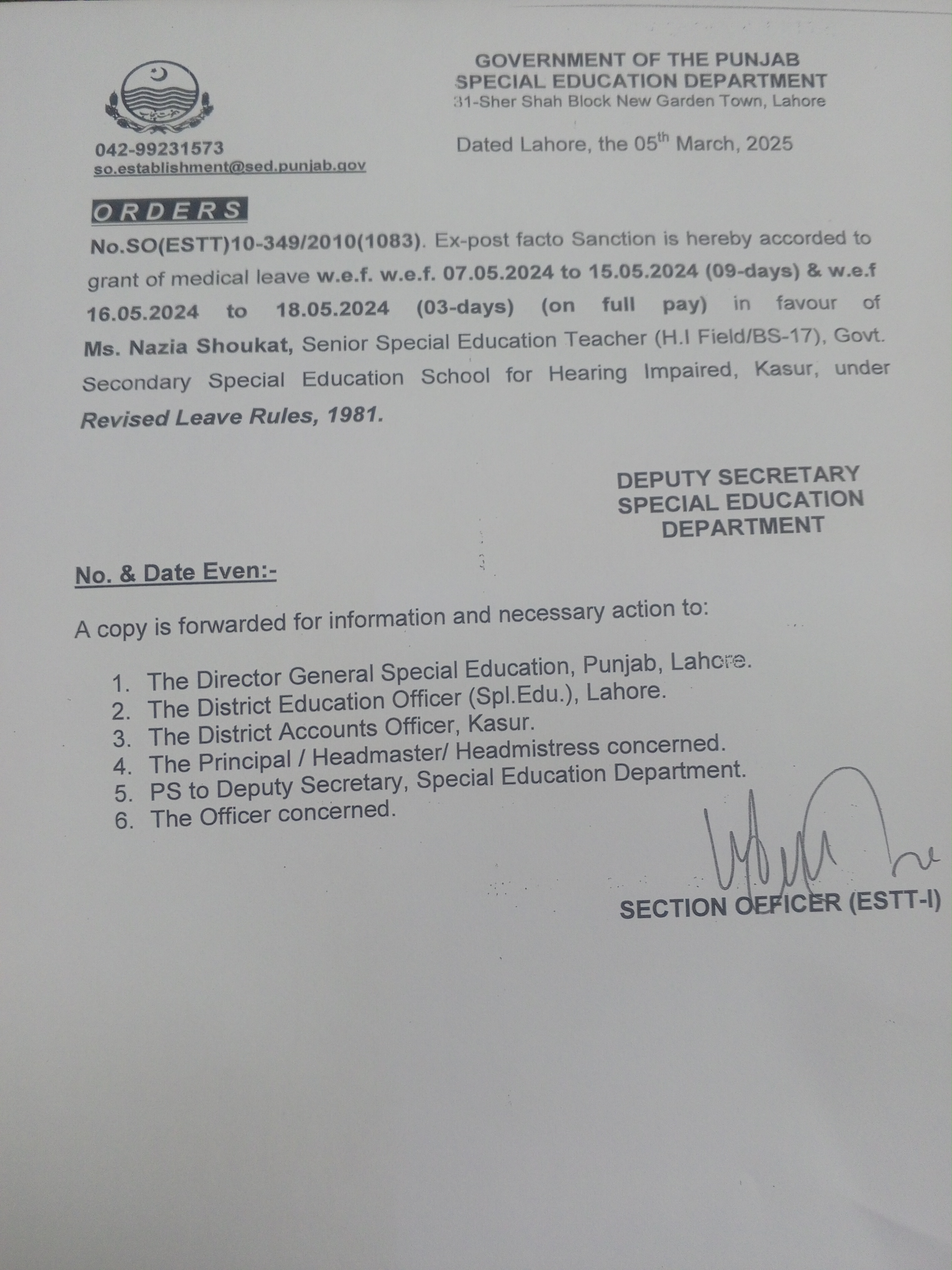 Category Leave Orders Date Thursday, March 6, 2025 - 12:00 Order No SO(ESTT.)10-349/2010 File 17412441845081883334120342748136.jpg3.25 MB Employee Name Nazia Shoukat Prominent Notifications