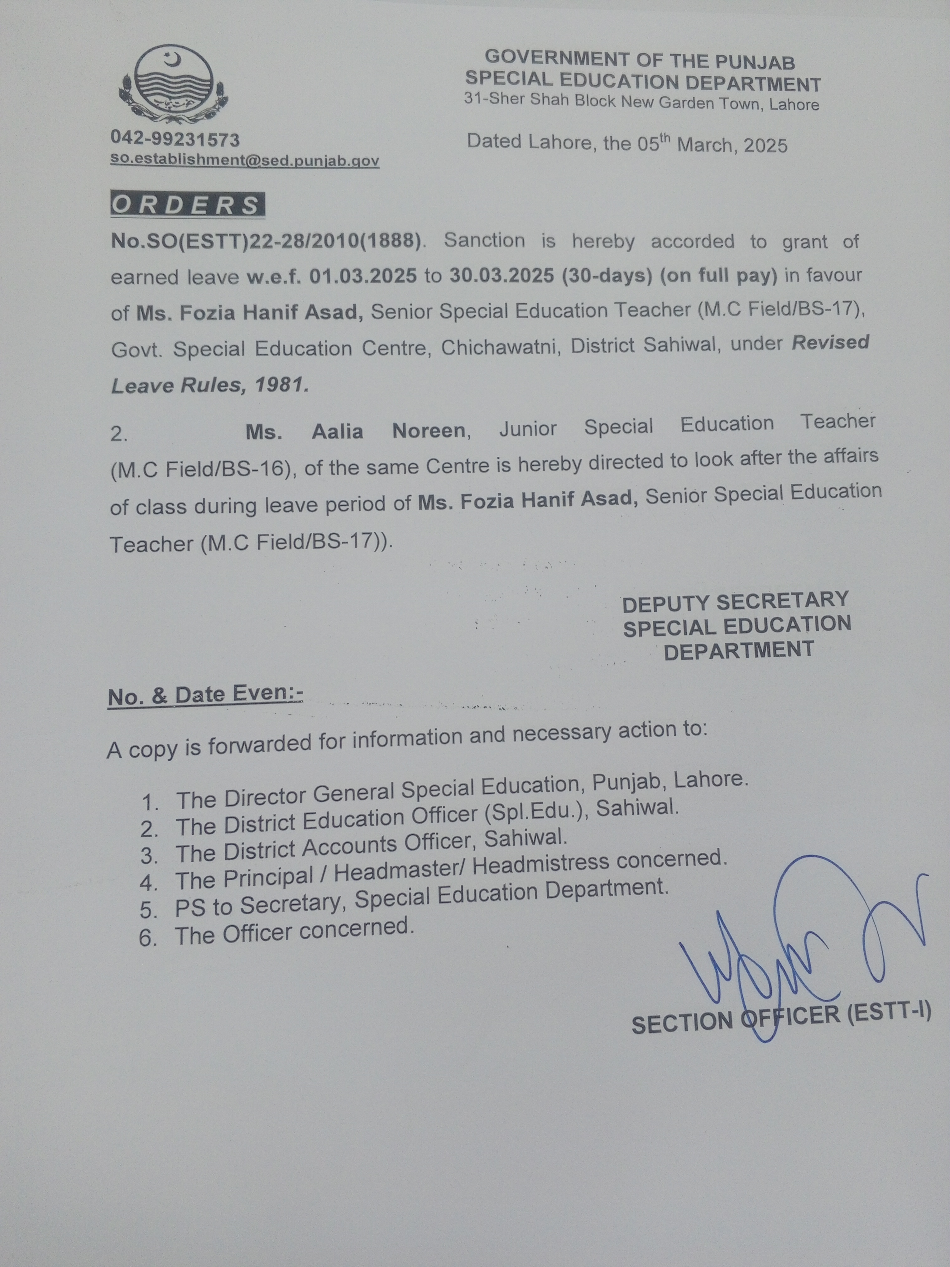 Category Leave Orders Date Thursday, March 6, 2025 - 12:00 Order No SO(ESTT.)22-28/2010 File 17412495576468985355980329047404.jpg3.26 MB Employee Name Fozia Hanif Asad Prominent Notifications
