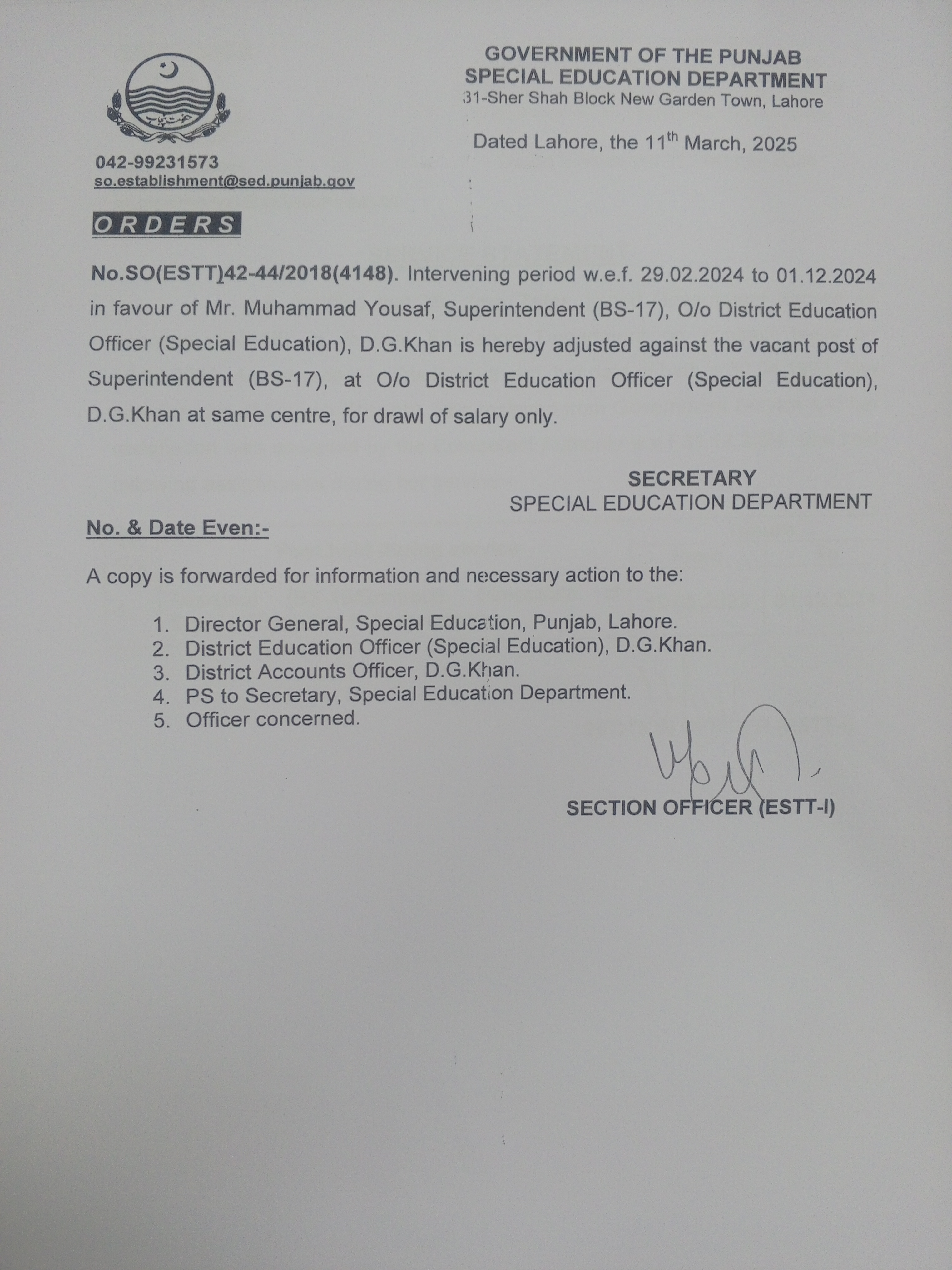 Category Others Date Tuesday, March 11, 2025 - 12:00 Order No SO(ESTT.)42-44/2018 File 17417551349571495974224750735995.jpg3.2 MB Employee Name Muhammad Yousaf Prominent Notifications