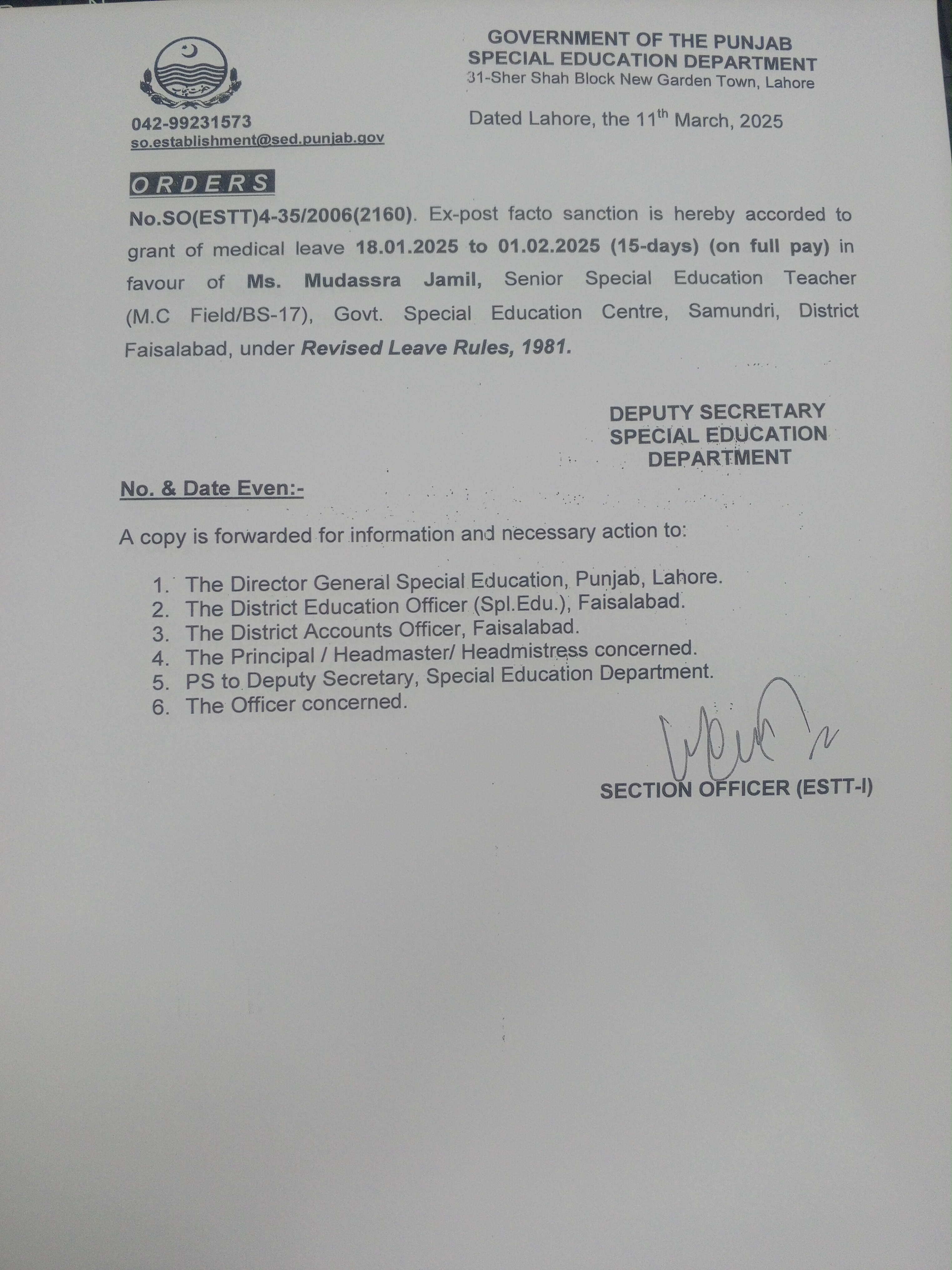 Category Leave Orders Date Tuesday, March 11, 2025 - 12:00 Order No SO(ESTT.)4-35/2006 File 17417563195943076049462761638545.jpg3.24 MB Employee Name Mudassra Jamil Prominent Notifications