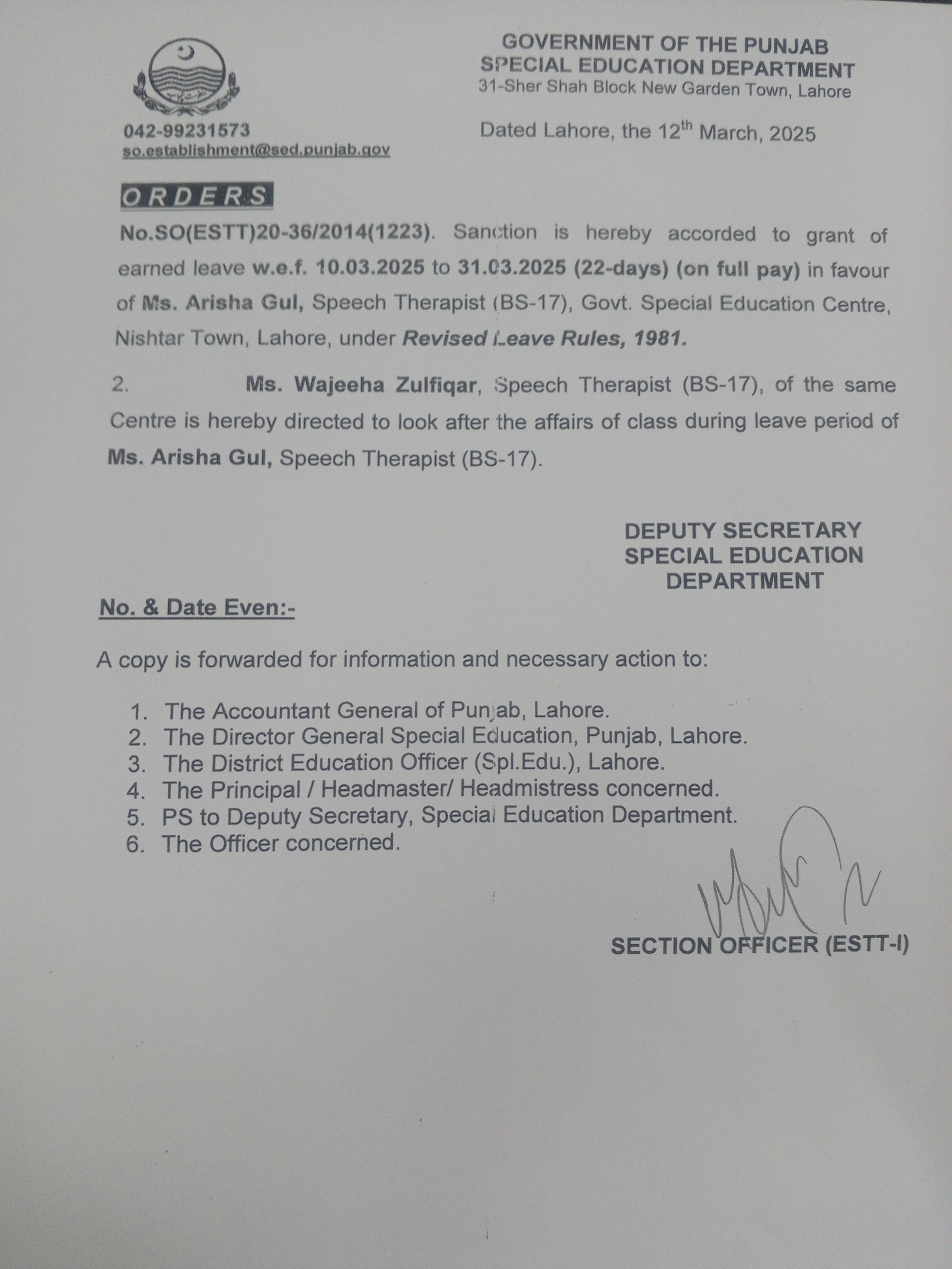 Category Leave Orders Date Thursday, March 13, 2025 - 12:00 Order No SO(ESTT.)20-36/2014 File 17418570942792442531165178744548.jpg3.25 MB Employee Name Arisha Gul Prominent Notifications