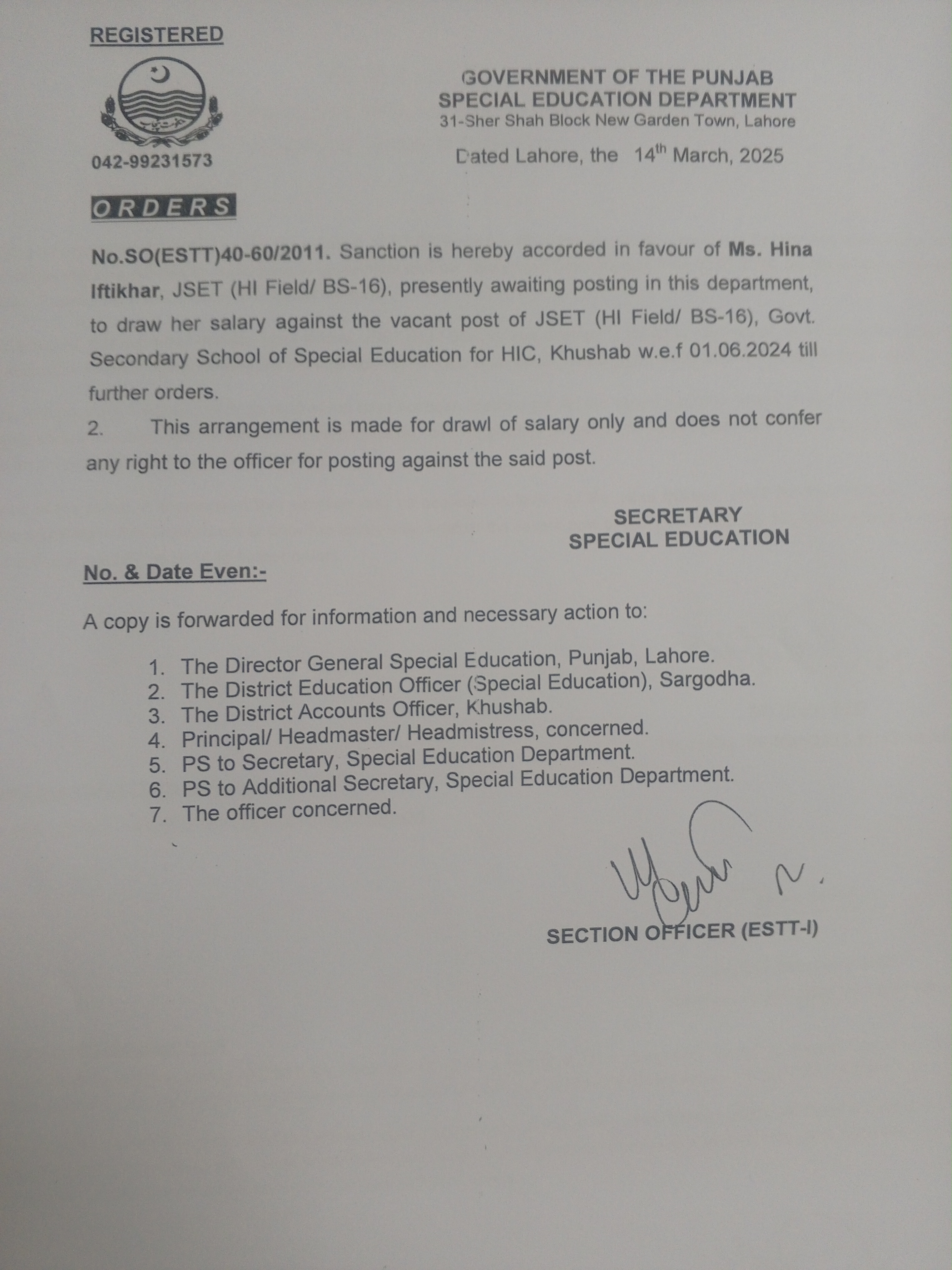 Category Others Date Friday, March 14, 2025 - 12:00 Order No SO(ESTT.)40-60/2011 File 17419306497702705972566863978758.jpg3.28 MB Employee Name Hina Iftikhar Prominent Notifications