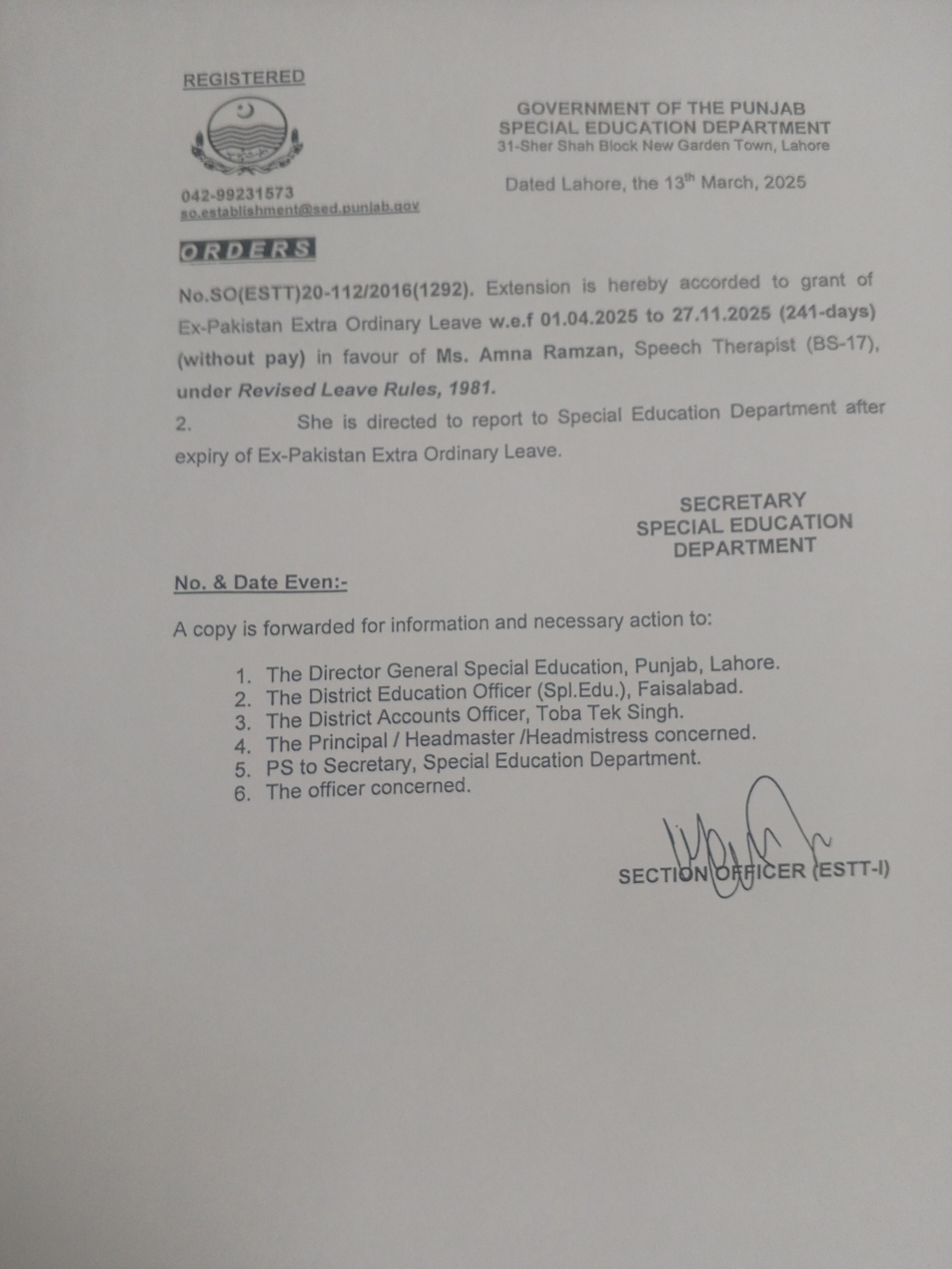 Category Leave Orders Date Friday, March 14, 2025 - 12:00 Order No SO(ESTT.)20-112/2016 File 17419351743038777543611178773310.jpg3.2 MB Employee Name Amna Ramzan Prominent Notifications