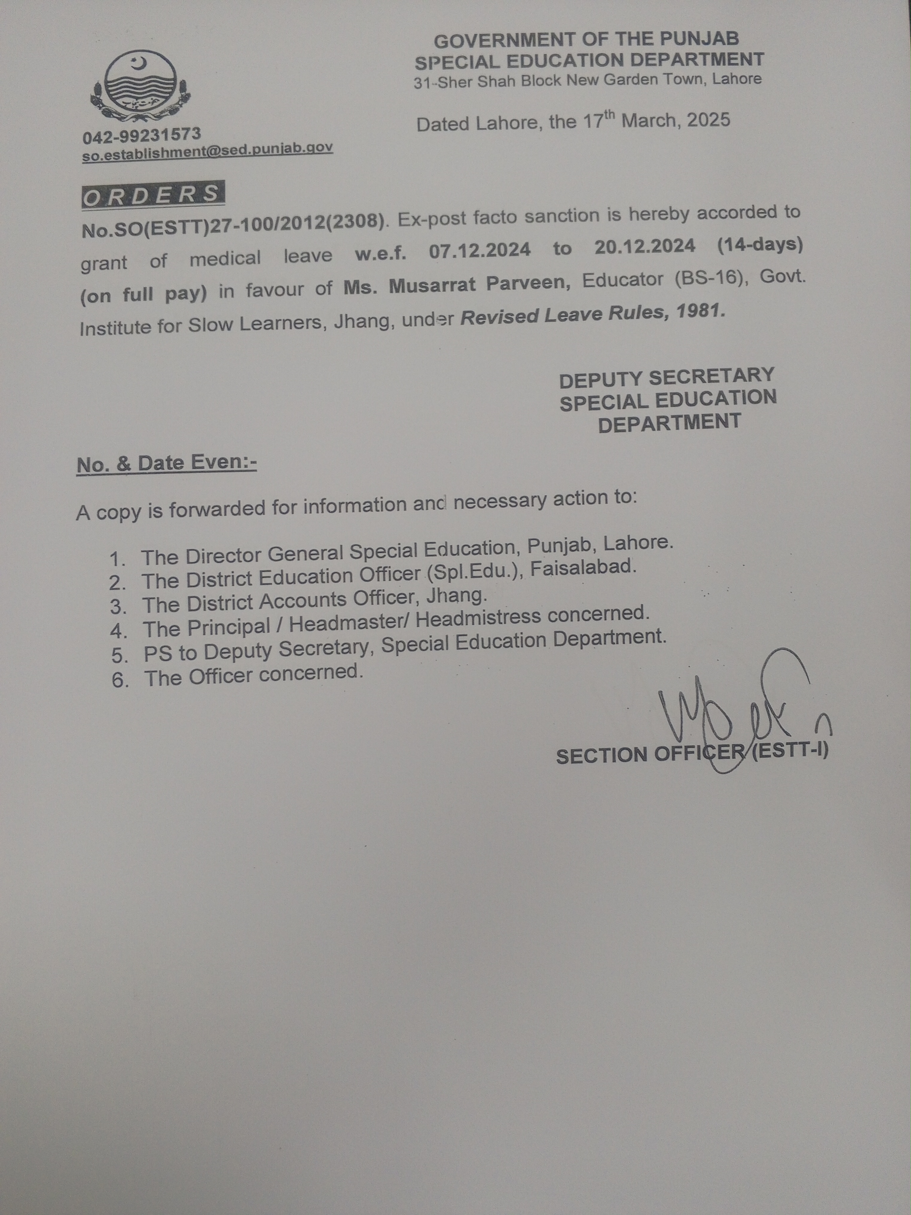 Category Leave Orders Date Tuesday, March 18, 2025 - 12:00 Order No SO(ESTT.)27-100/2012 File 17422830587395448049971884798897.jpg3.32 MB Employee Name Musarrat Parveen Prominent Notifications