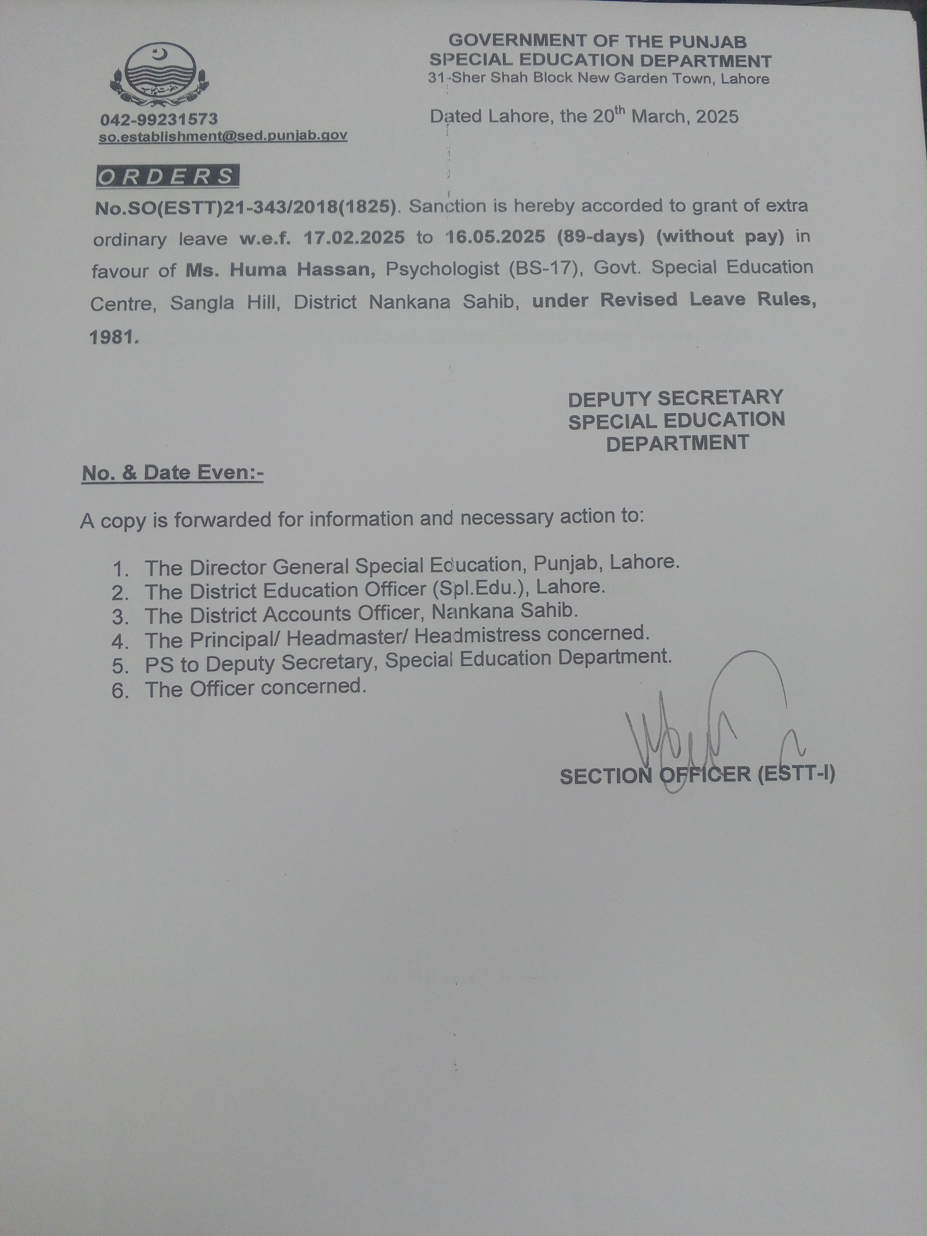 Category Leave Orders Date Friday, March 21, 2025 - 12:00 Order No SO(ESTT.)21-343/2018 File 17425345686566625354614729307223.jpg3.38 MB Employee Name Huma Hassan Prominent Notifications