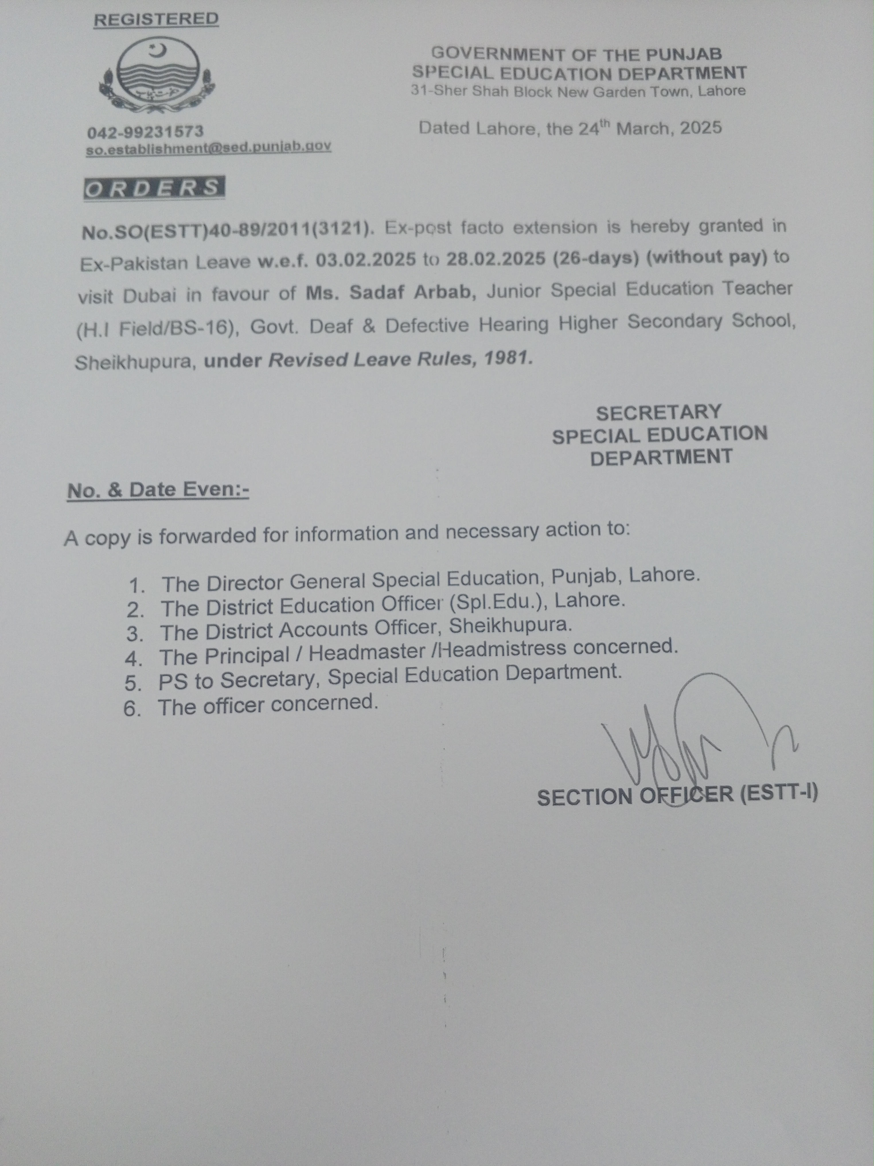 Category Leave Orders Date Tuesday, March 25, 2025 - 12:00 Order No SO(ESTT.)40-89/2011 File 1742883627070846518624760288811.jpg3.07 MB Employee Name Sadaf Arbab Prominent Notifications