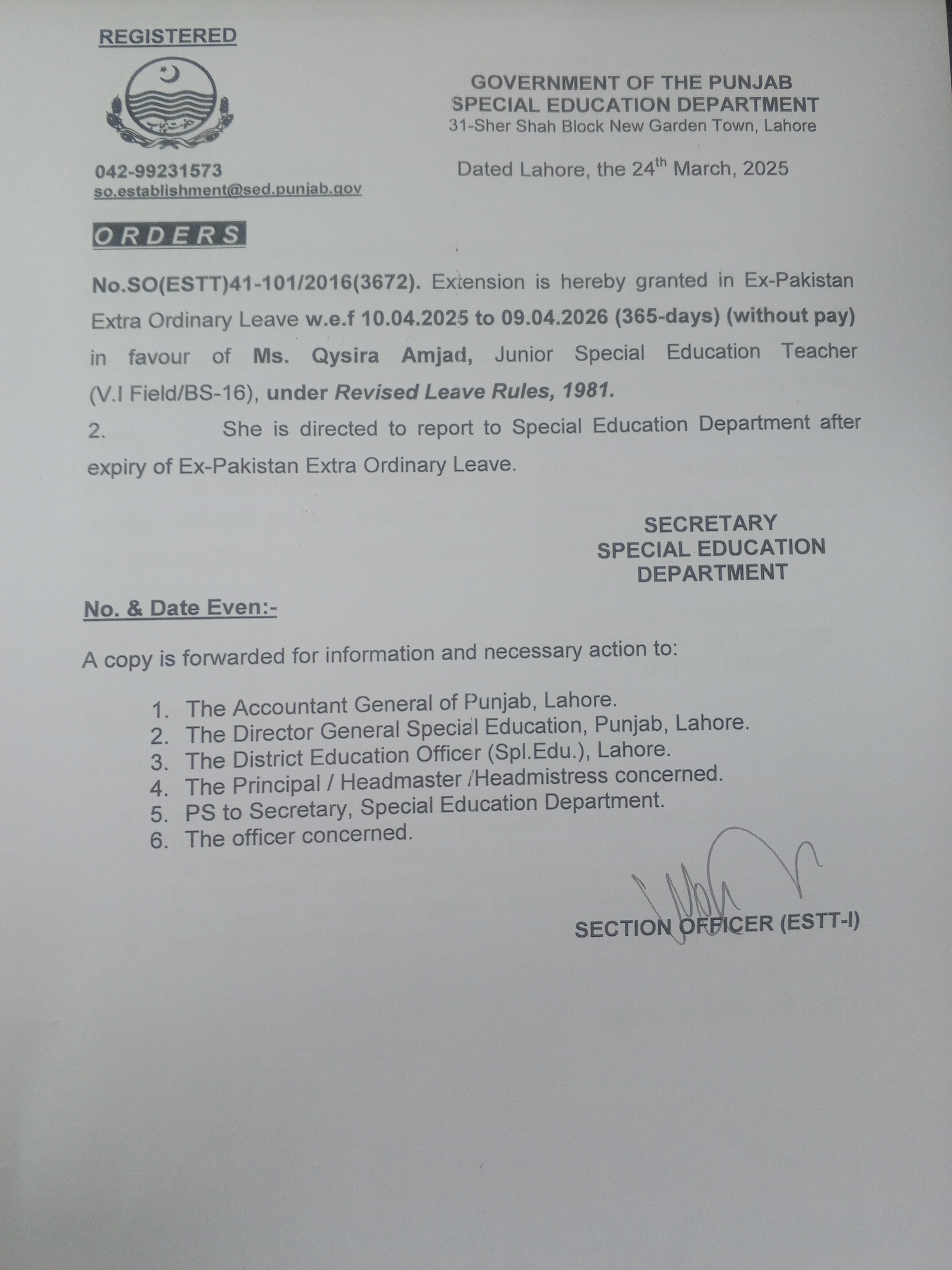 Category Leave Orders Date Tuesday, March 25, 2025 - 12:00 Order No SO(ESTT.)41-101/2016 File 17428951696972147173348234834820.jpg3.2 MB Employee Name Qysira Amjad Prominent Notifications