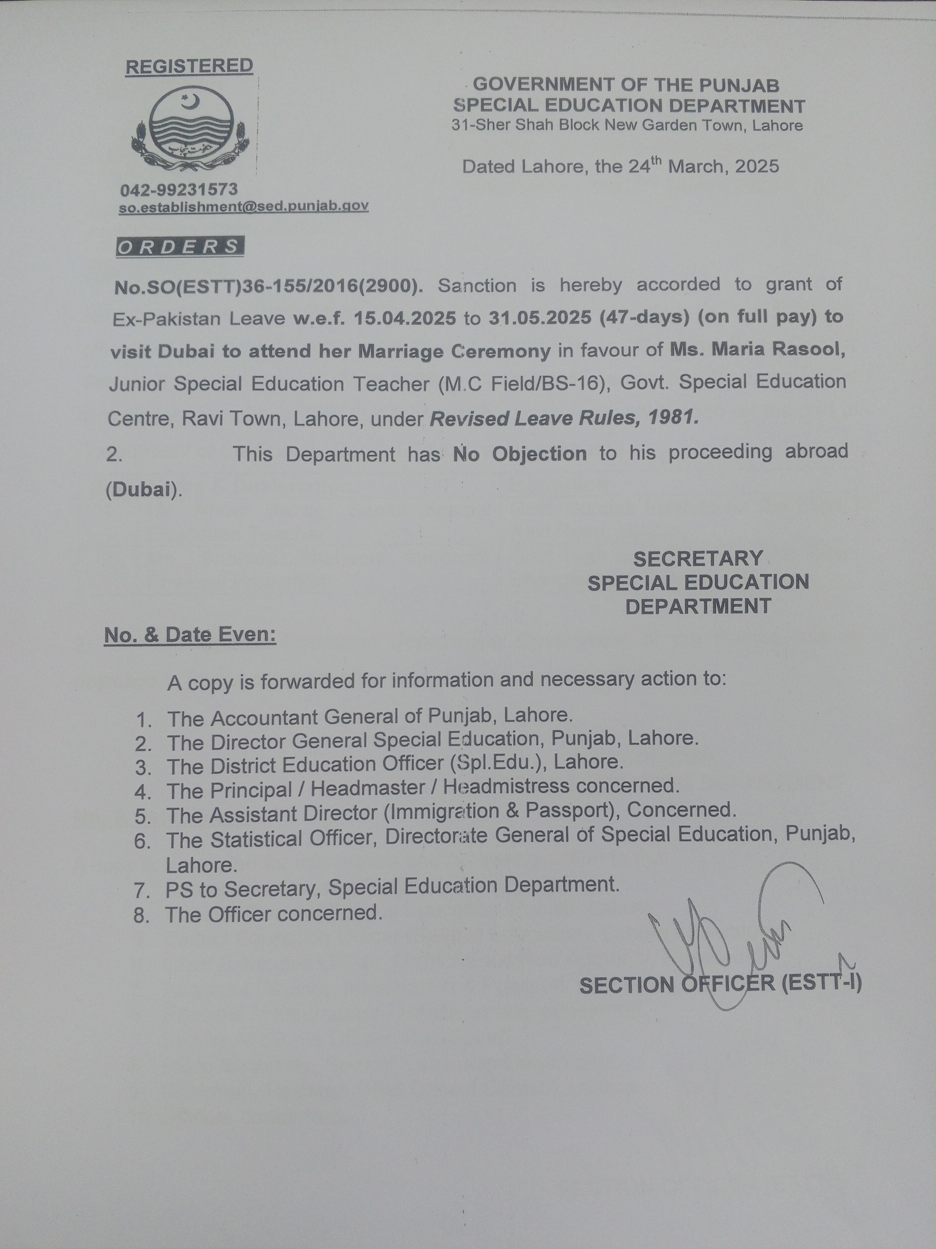 Category Leave Orders Date Friday, March 28, 2025 - 12:00 Order No SO(ESTT.)36-155/2016 File 1743141058878437870354154050695.jpg3.32 MB Employee Name Maria Rasool Prominent Notifications