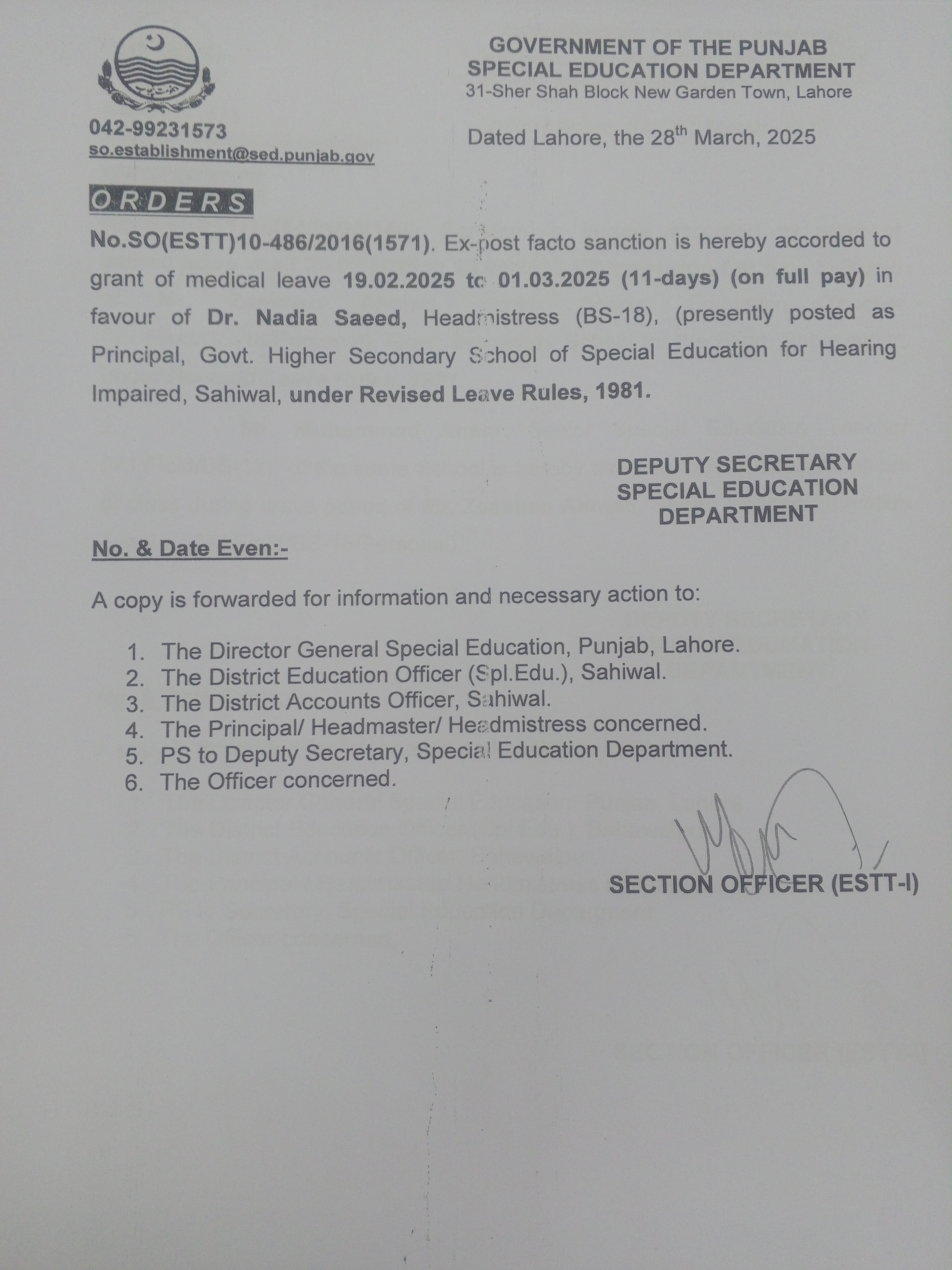 Category Leave Orders Date Friday, March 28, 2025 - 12:00 Order No SO(ESTT.)10-486/2016 File 1743665814624310872998165406285.jpg3.31 MB Employee Name Dr. Nadia Saeed Prominent Notifications
