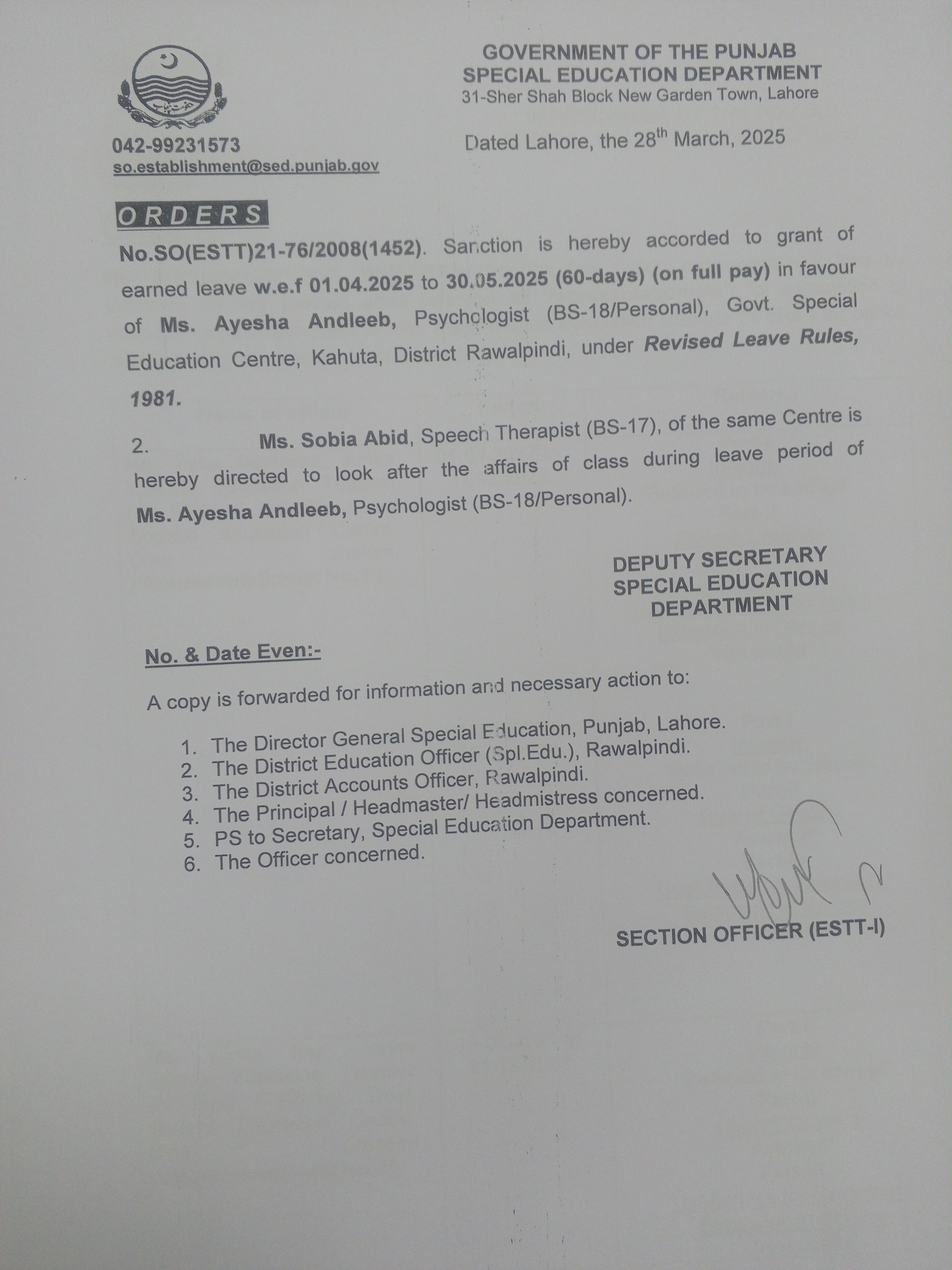 Category Leave Orders Date Friday, March 28, 2025 - 12:00 Order No SO(ESTT.)21-76/2008 File 17436660618021297645721978141781.jpg3.27 MB Employee Name Ayesha Andleeb Prominent Notifications