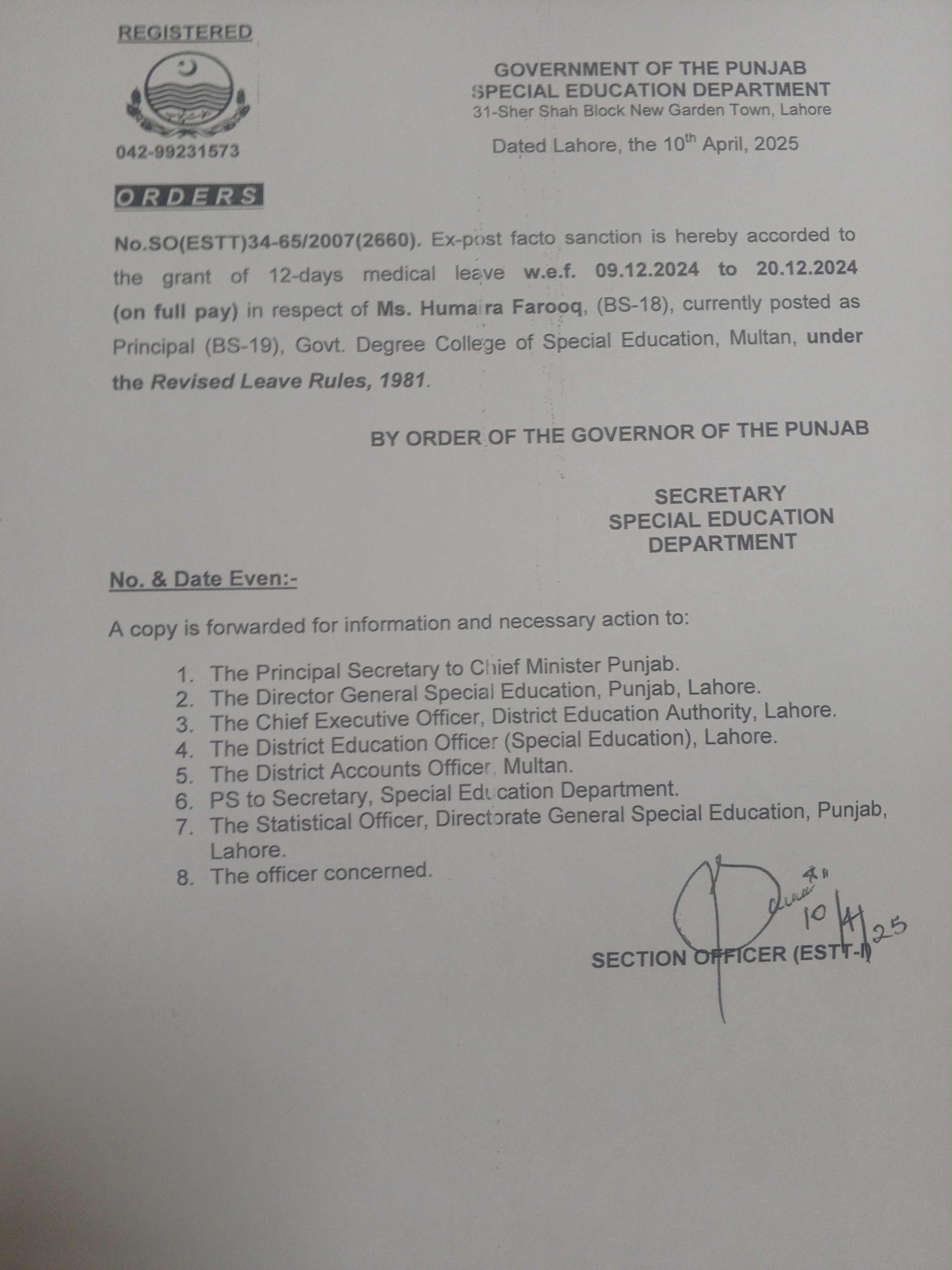 Category Leave Orders Date Friday, April 11, 2025 - 12:00 Order No SO(ESTT.)34-65/2007 File 17443710567633907333343703013534.jpg3.46 MB Employee Name Humaira Farooq Prominent Notifications