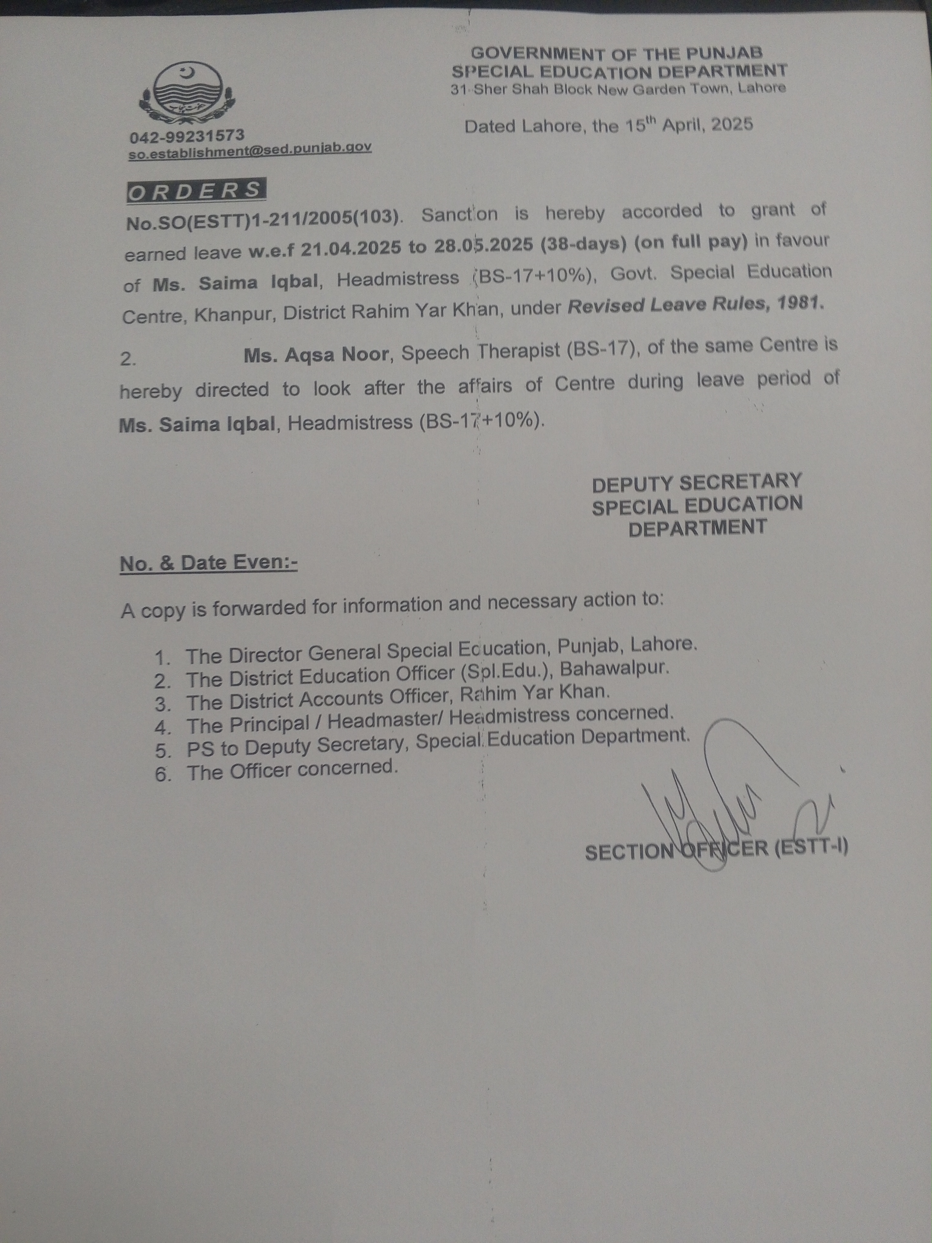 Category Leave Orders Date Wednesday, April 16, 2025 - 12:00 Order No SO(ESTT.)1-211/2005 File 17447882673073566016699467688173.jpg3.55 MB Employee Name Saima Iqbal Prominent Notifications