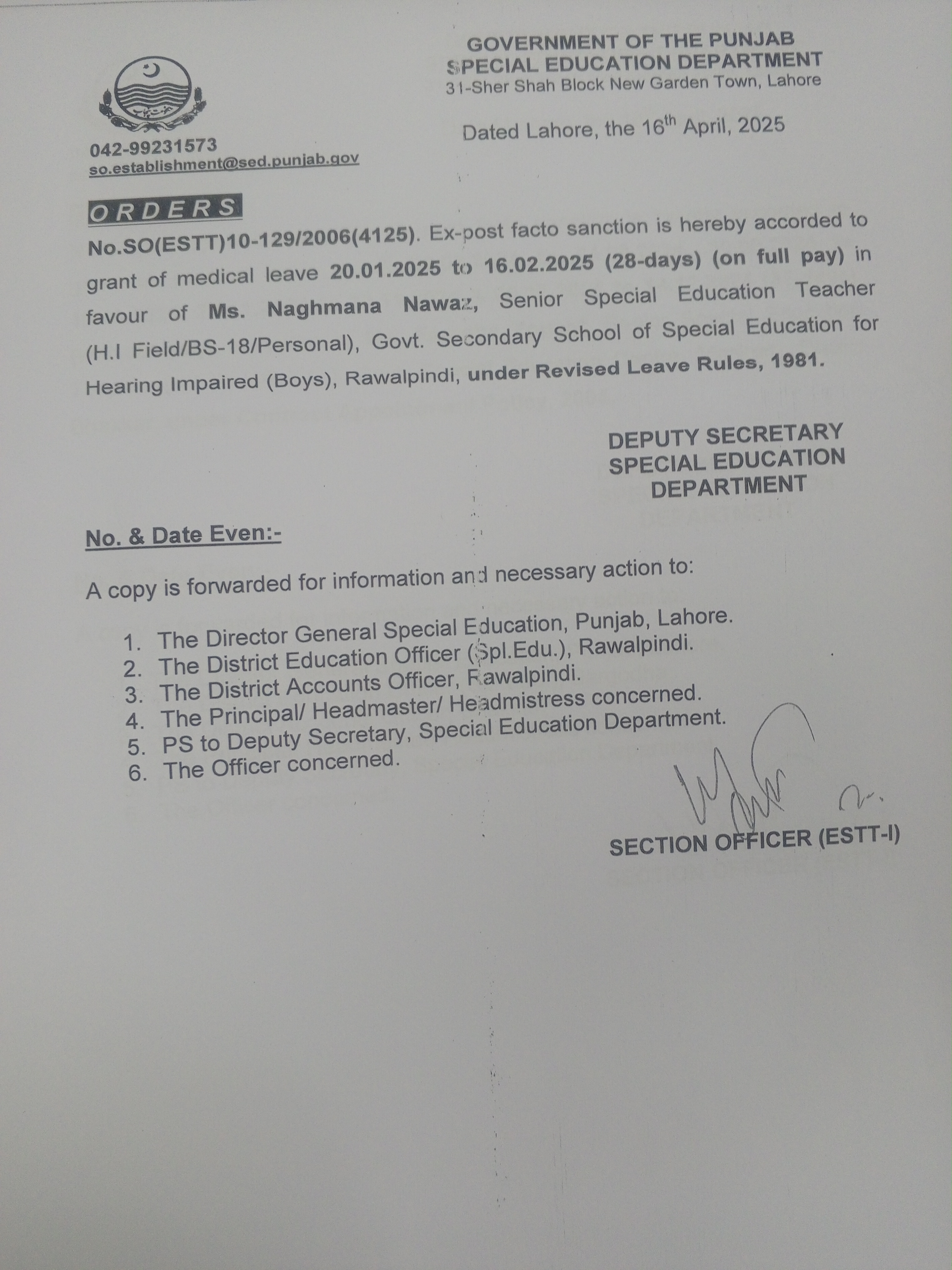 Category Leave Orders Date Wednesday, April 16, 2025 - 12:00 Order No SO(ESTT.)10-129/2006 File 1744865573374985551231149261860.jpg3.27 MB Employee Name Naghmana Nawaz Prominent Notifications