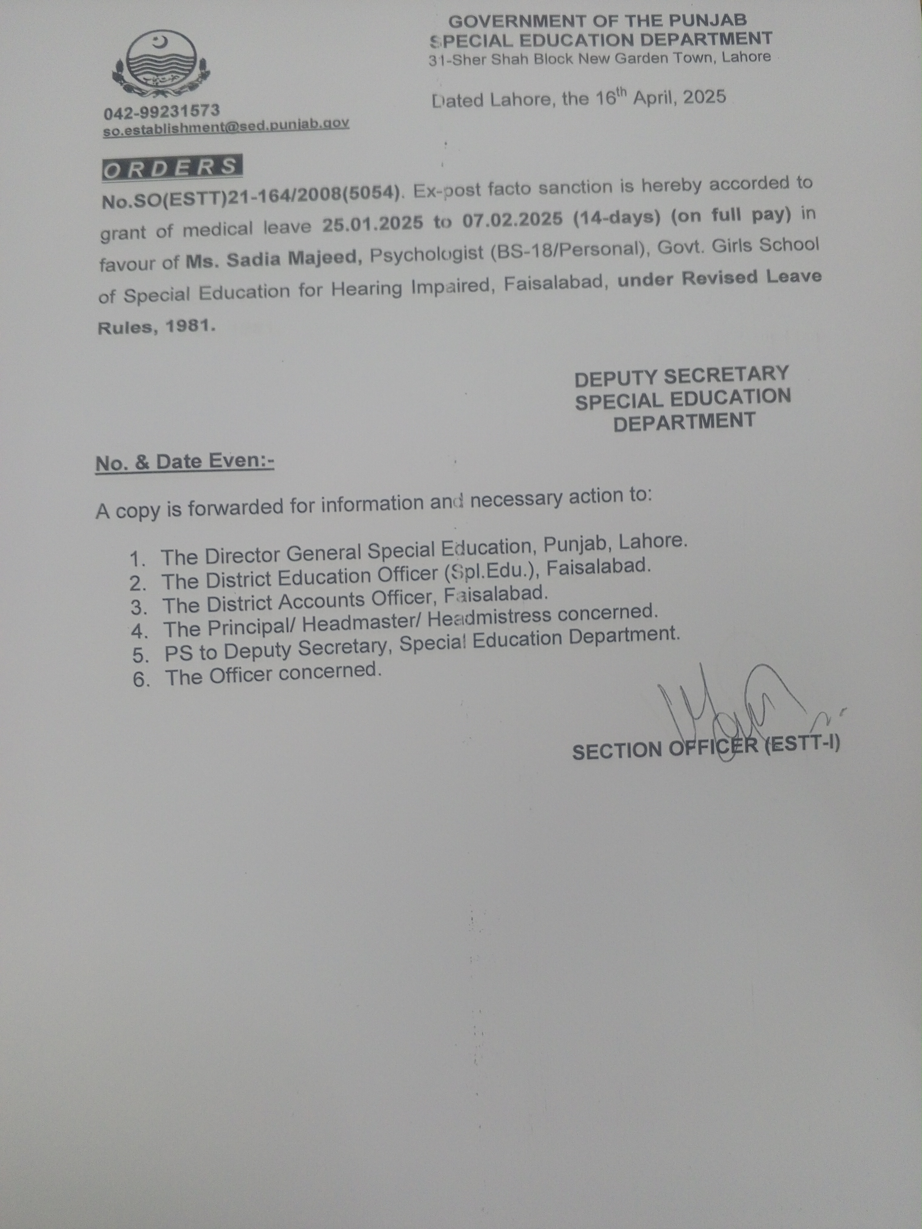 Category Leave Orders Date Wednesday, April 16, 2025 - 12:00 Order No SO(ESTT.)21-164/2008 File 17448660286772238358522205814267.jpg3.21 MB Employee Name Sadia Majeed Prominent Notifications