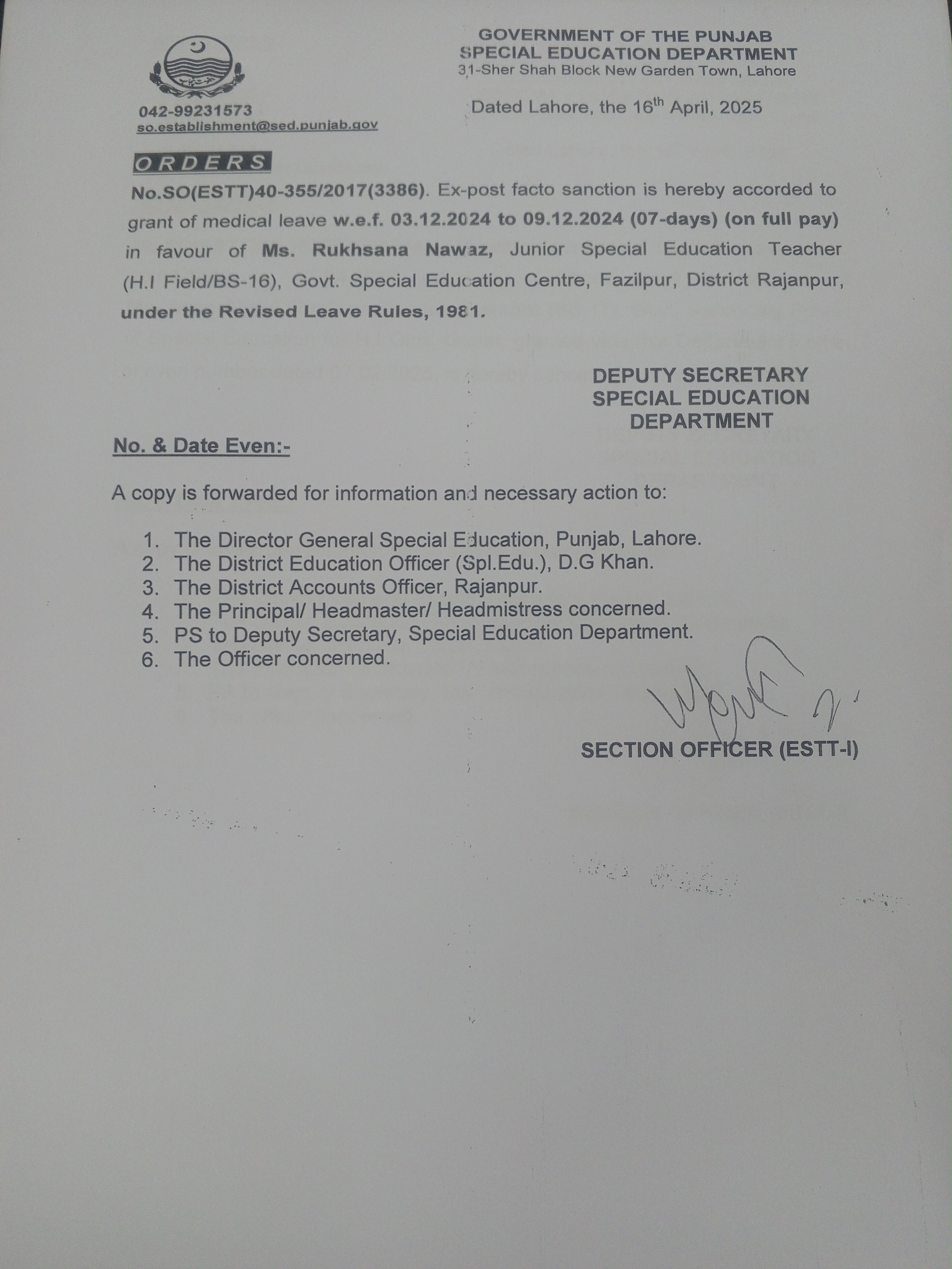 Category Leave Orders Date Wednesday, April 16, 2025 - 12:00 Order No SO(ESTT.)40-355/2017 File 17448673017726316315863370642867.jpg3.38 MB Employee Name Rukhsana Nawaz Prominent Notifications