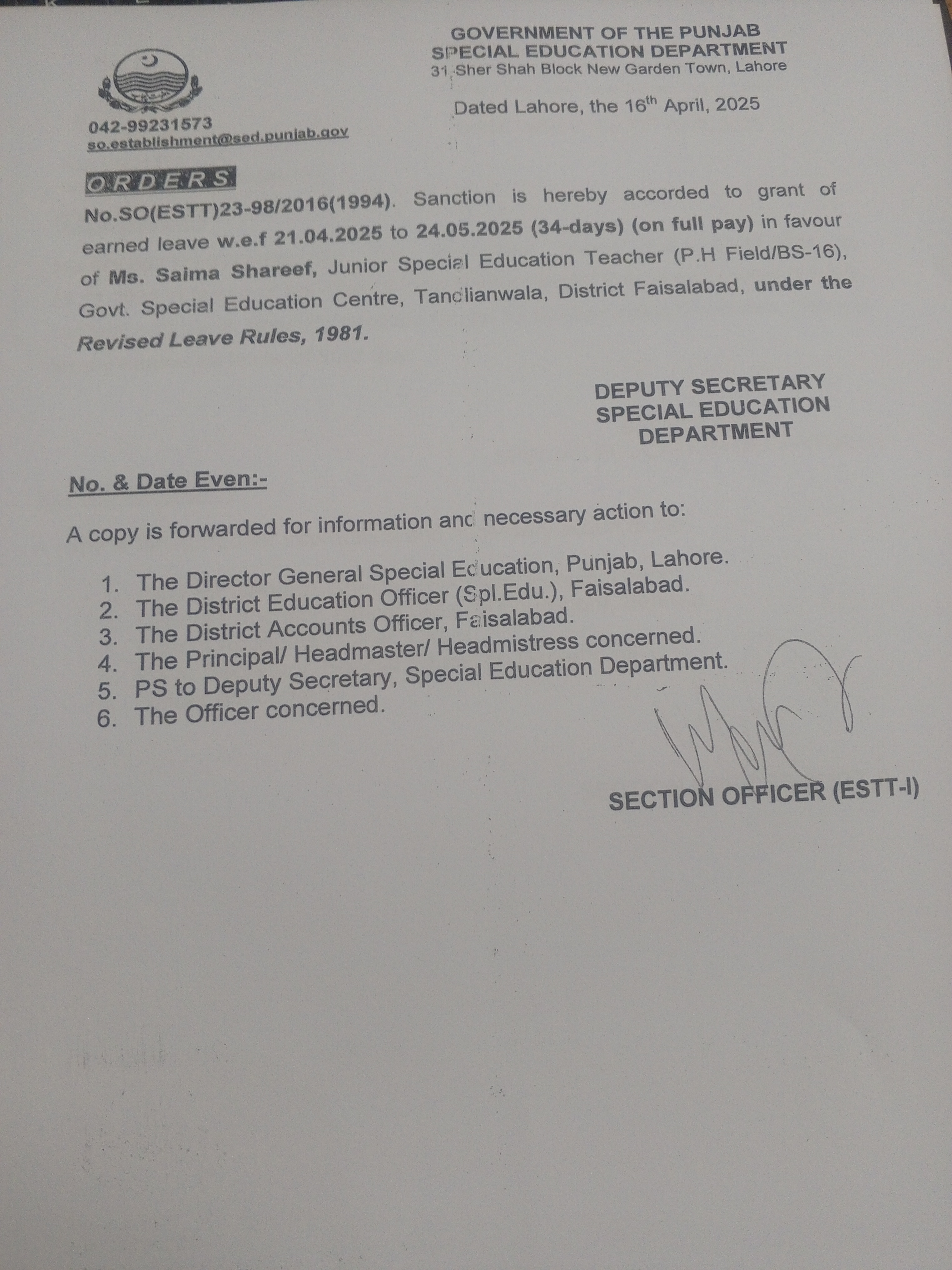 Category Leave Orders Date Friday, April 18, 2025 - 12:00 Order No SO(ESTT.)23-98/2016 File 17449546225864338052856032135859.jpg3.51 MB Employee Name Saima Shareef Prominent Notifications