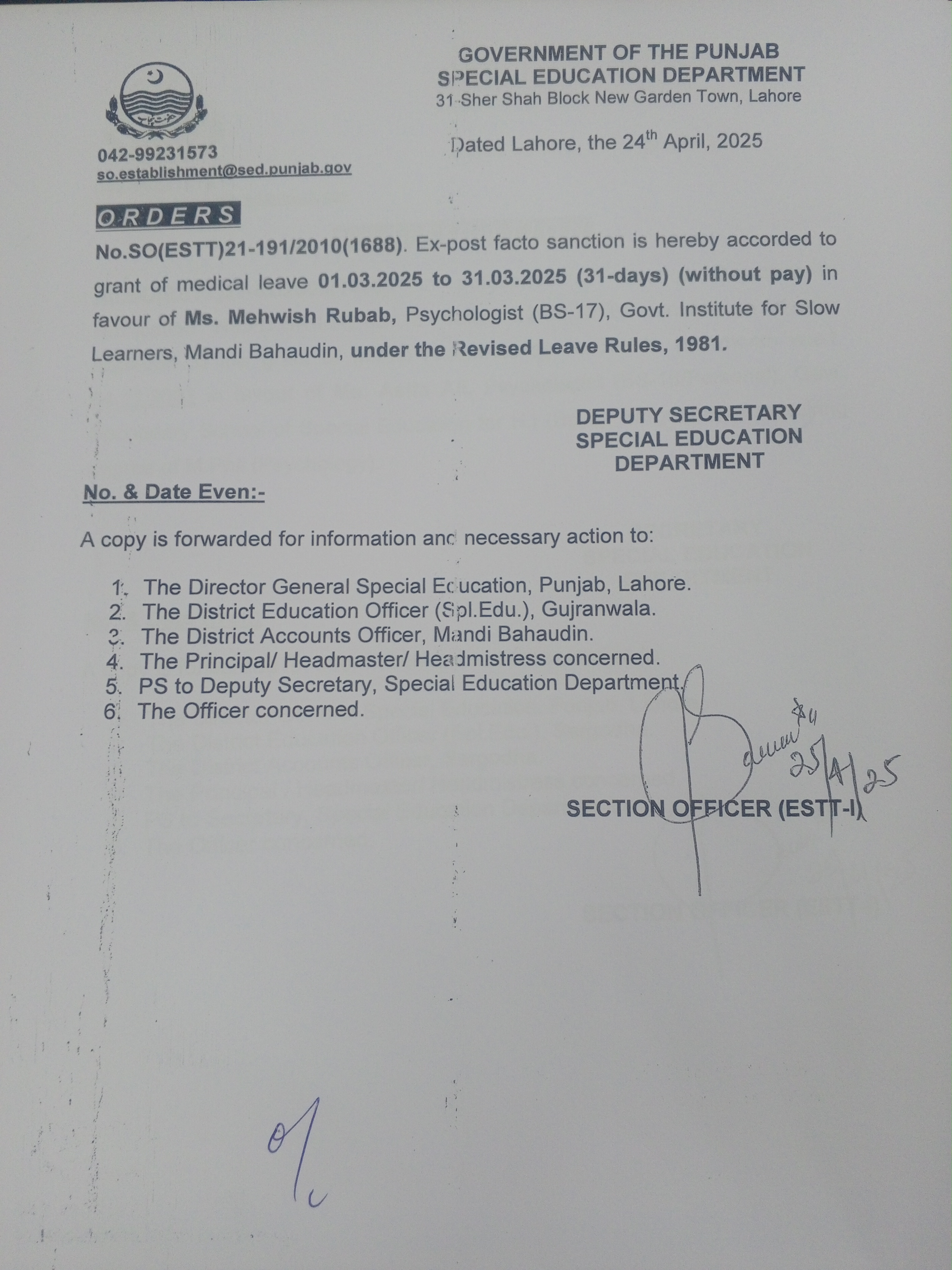 Category Leave Orders Date Friday, April 25, 2025 - 12:00 Order No SO(ESTT.)21-191/2010 File 17455723029892894764512721180835.jpg3.24 MB Employee Name Mehwish Rubab Prominent Notifications