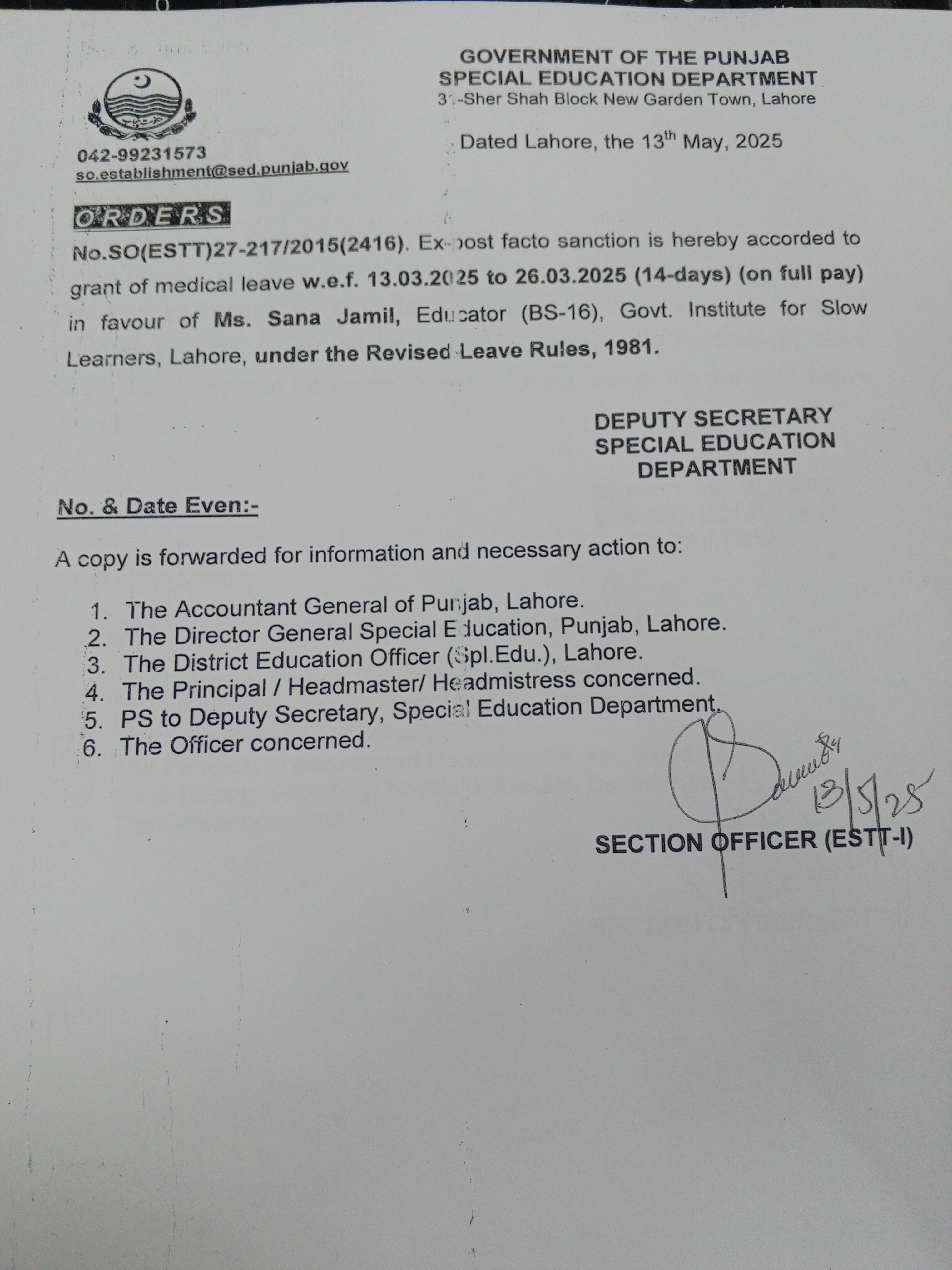 Category Leave Orders Date Wednesday, May 14, 2025 - 12:00 Order No SO(ESTT.)27-217/2015 File 17472015974256098331176097300373.jpg3.35 MB Employee Name Sana Jamil Prominent Notifications