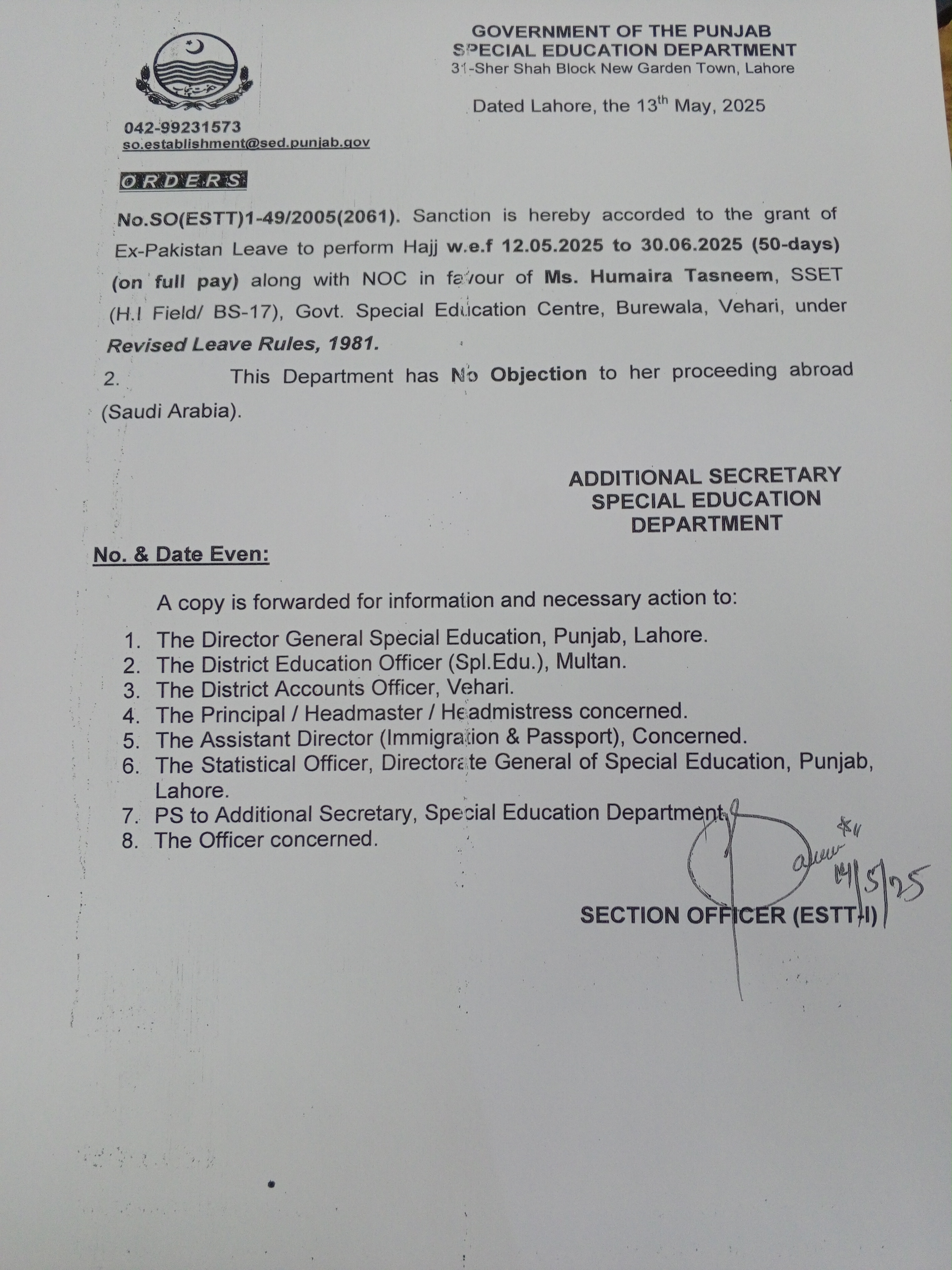 Category Leave Orders Date Wednesday, May 14, 2025 - 12:00 Order No SO(ESTT.)1-49/2005 File 17472049350817712943596909817479.jpg3.41 MB Employee Name Humaira Tasneem Prominent Notifications