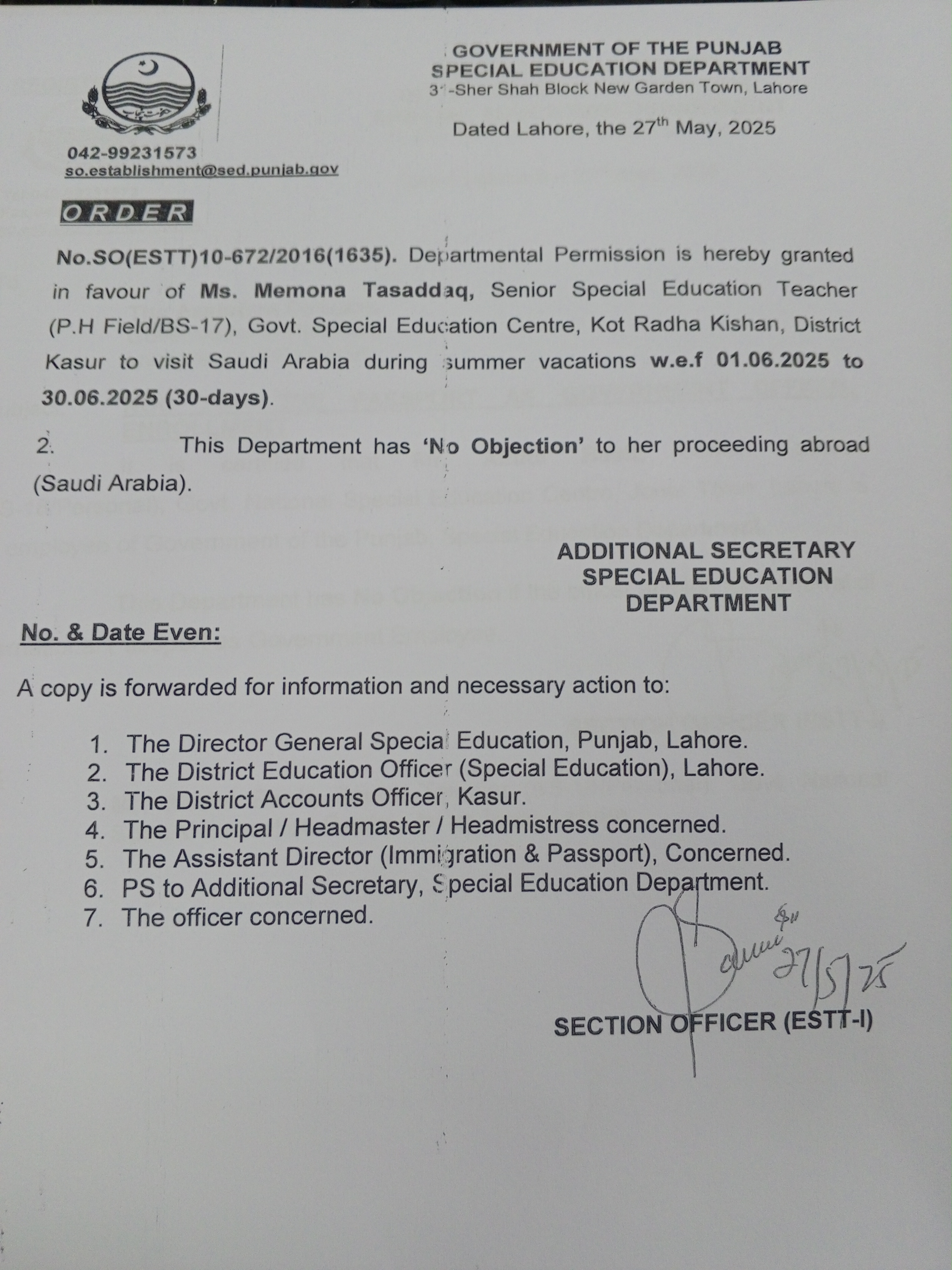 Category Leave Orders Date Thursday, May 29, 2025 - 12:00 Order No SO(ESTT.)10-672/2016 File 17485056484782487070240276319878.jpg3.33 MB Employee Name Memoona Tasaddaq Prominent Notifications