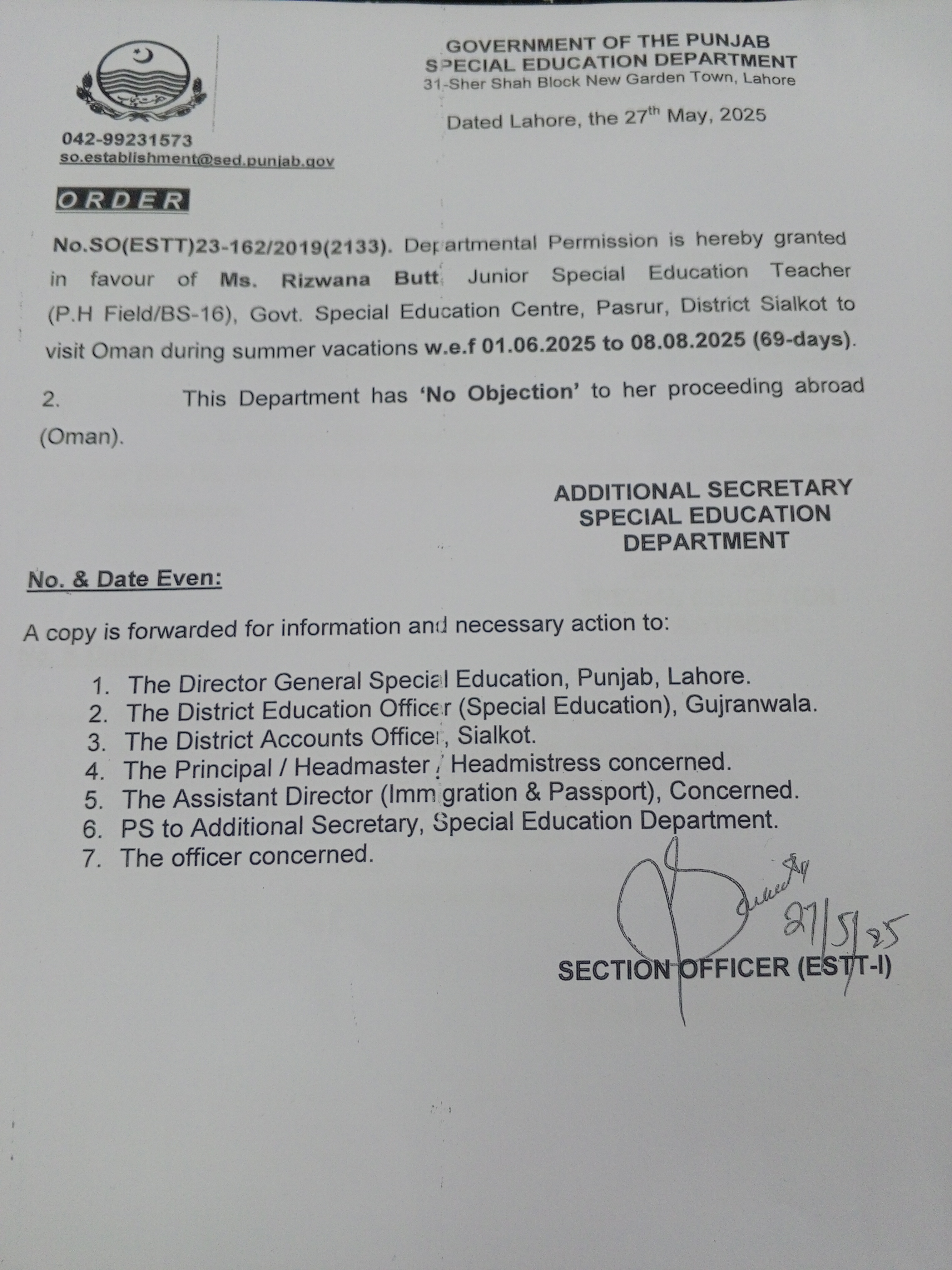 Category Leave Orders Date Thursday, May 29, 2025 - 12:00 Order No SO(ESTT.)23-162/2019 File 17485063436714454646017849780538.jpg3.32 MB Employee Name Rizwan Butt Prominent Notifications