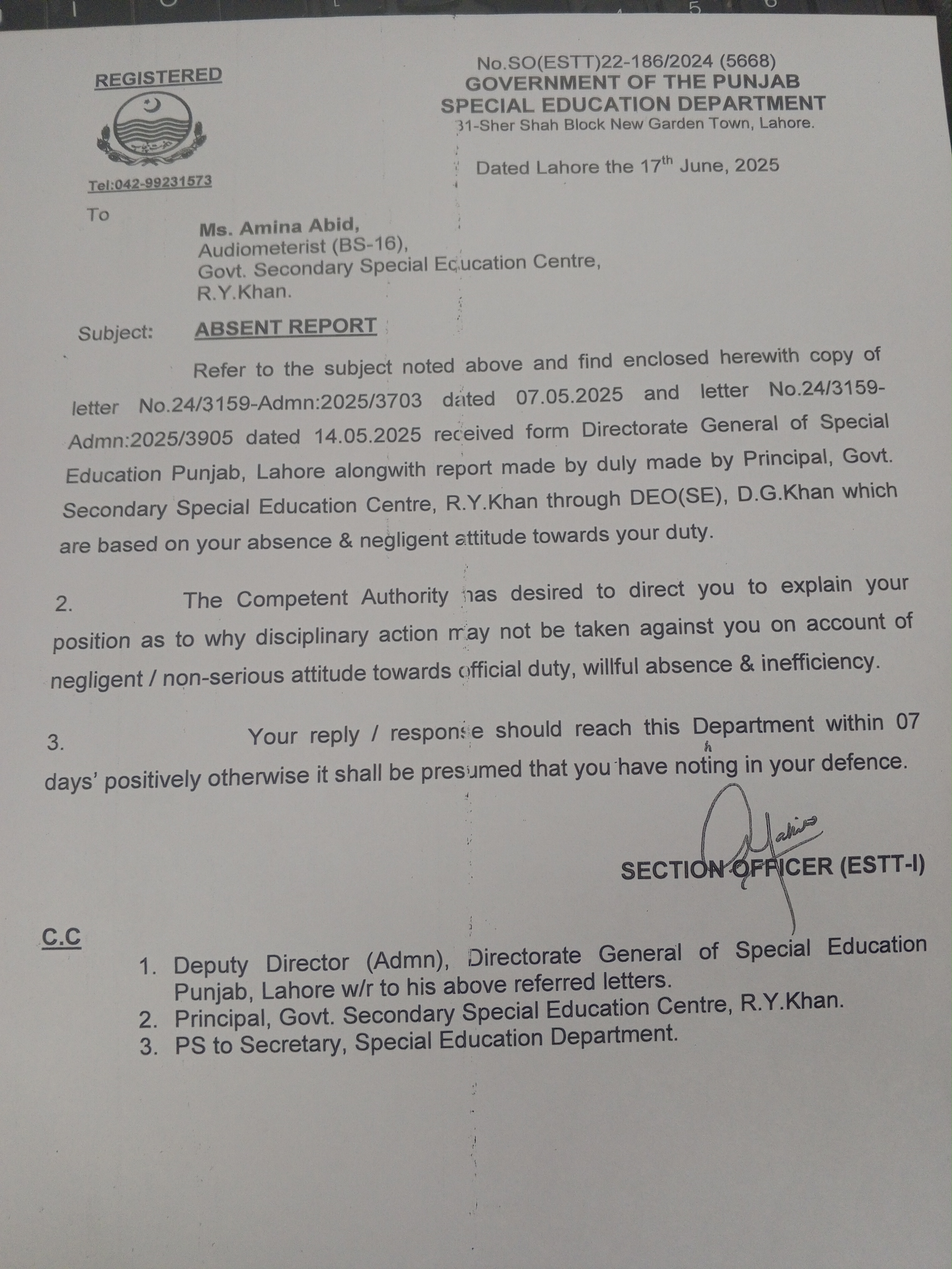 Category Others Date Tuesday, June 17, 2025 - 12:00 Order No SO(ESTT.)22-186/2024 File 17501503127348378790234391834386.jpg3.6 MB Employee Name Amina Abid Prominent Notifications