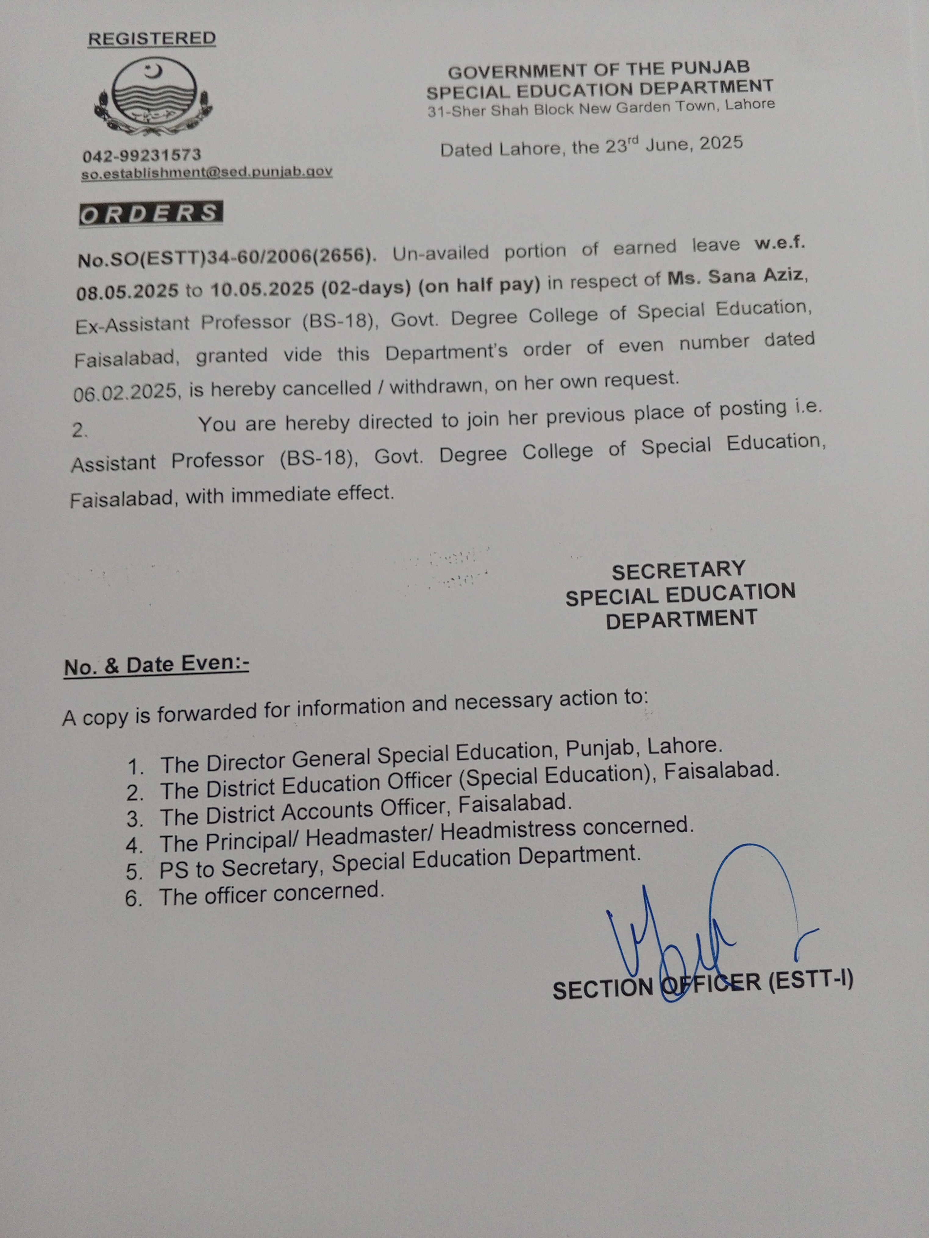Category Leave Orders Date Monday, June 23, 2025 - 12:00 Order No SO(ESTT.)34-60/2006 File 17506697559753098106584930504745.jpg3.57 MB Employee Name Sana Aziz Prominent Notifications