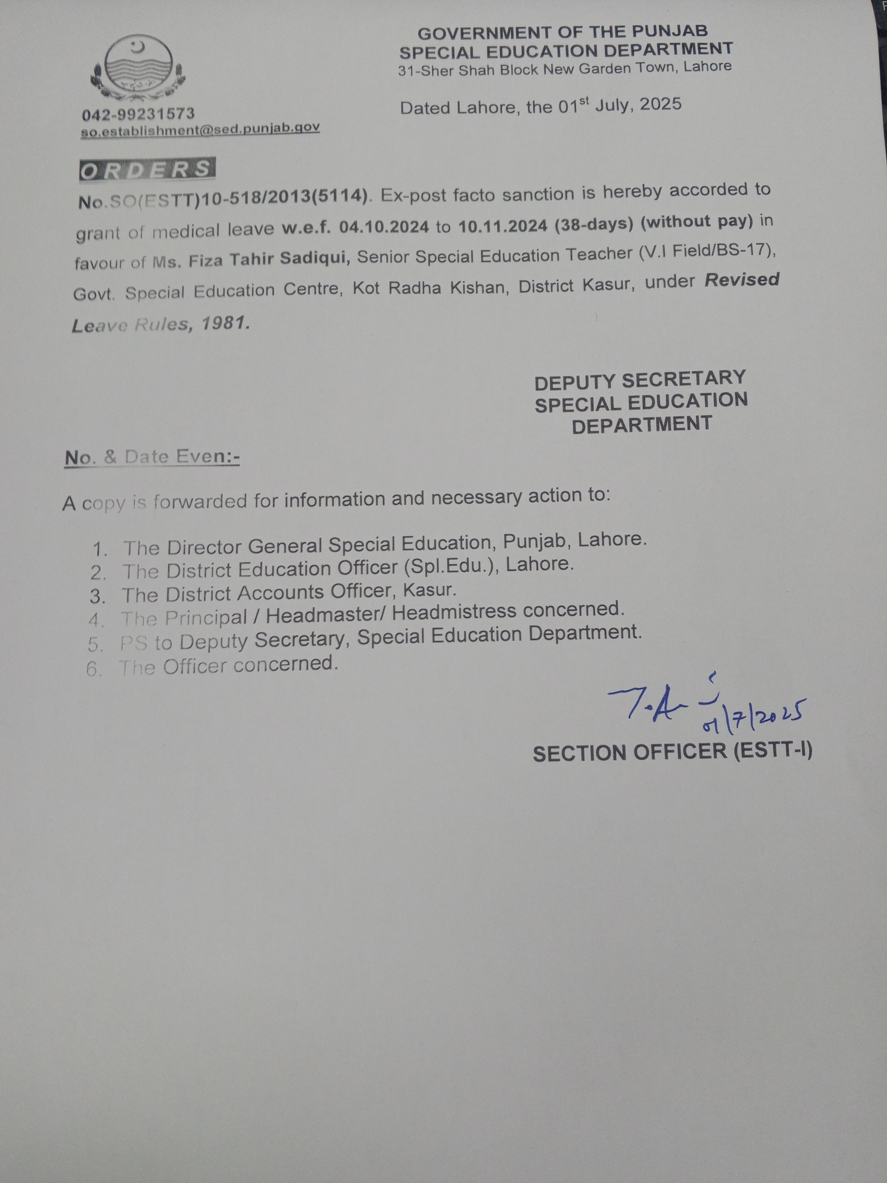 Category Leave Orders Date Tuesday, July 1, 2025 - 12:00 Order No SO(ESTT.)10-518/2013 File 17513585583726832775811940342280.jpg3.27 MB Employee Name Faiza Tahir Sadiqui Prominent Notifications