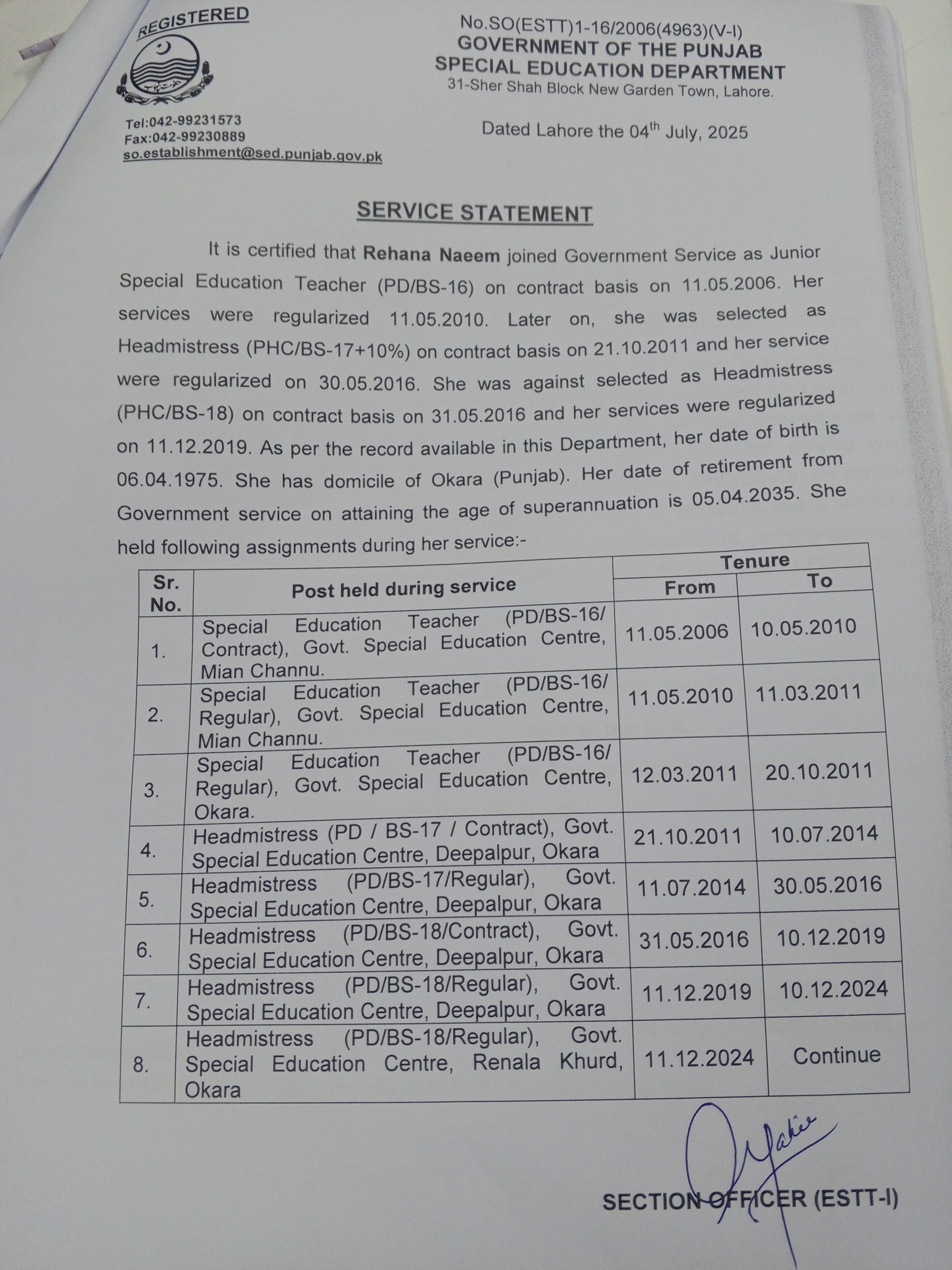 Category Departmental Permissions Date Friday, July 4, 2025 - 12:00 Order No SO(ESTT.)1-16/2006 File 17516233265393075627886585644076.jpg3.76 MB Employee Name Rehana Naeem Prominent Notifications