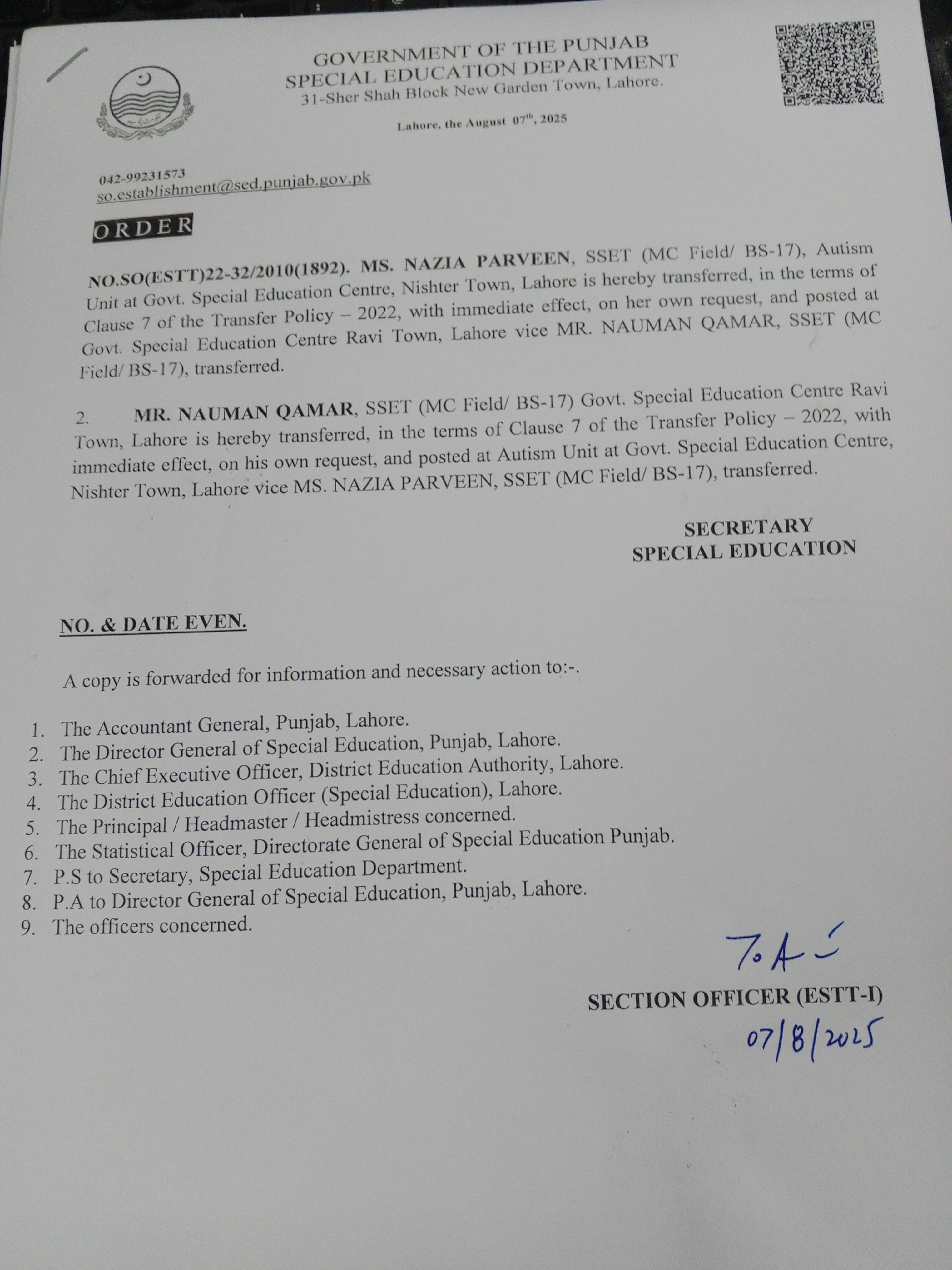 Transfer / Posting Orders