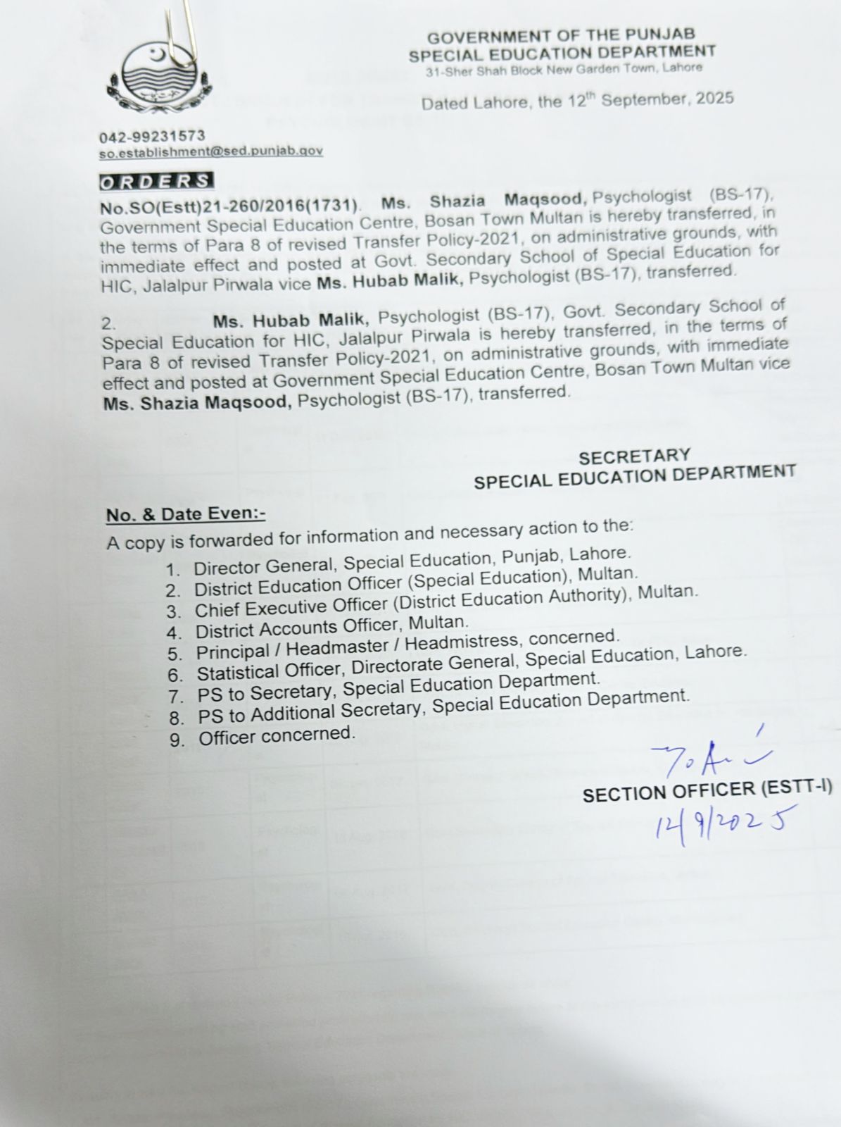 Transfer / Posting Orders