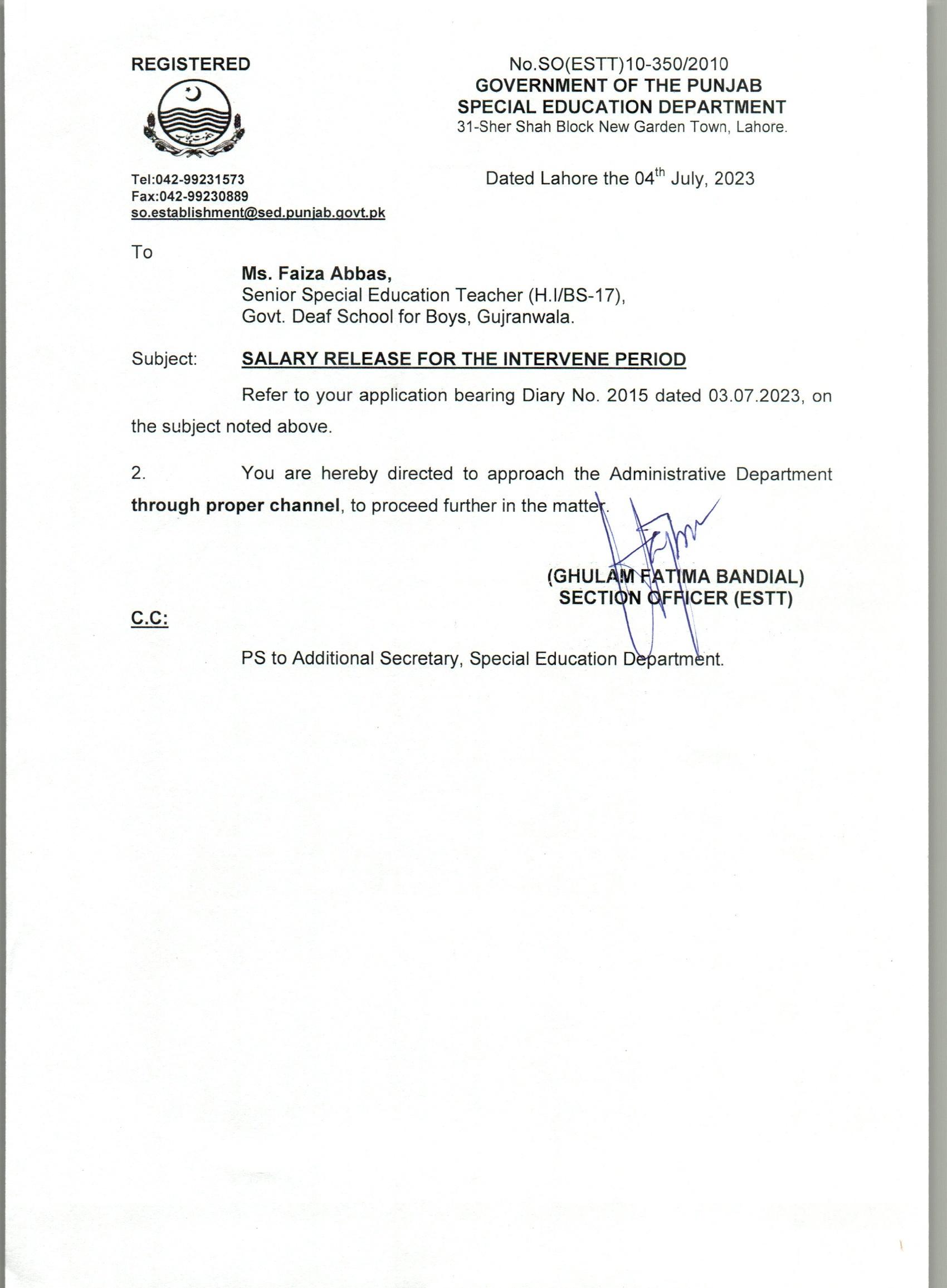 Reply (Request for Salary Release for the Intervening Period) |