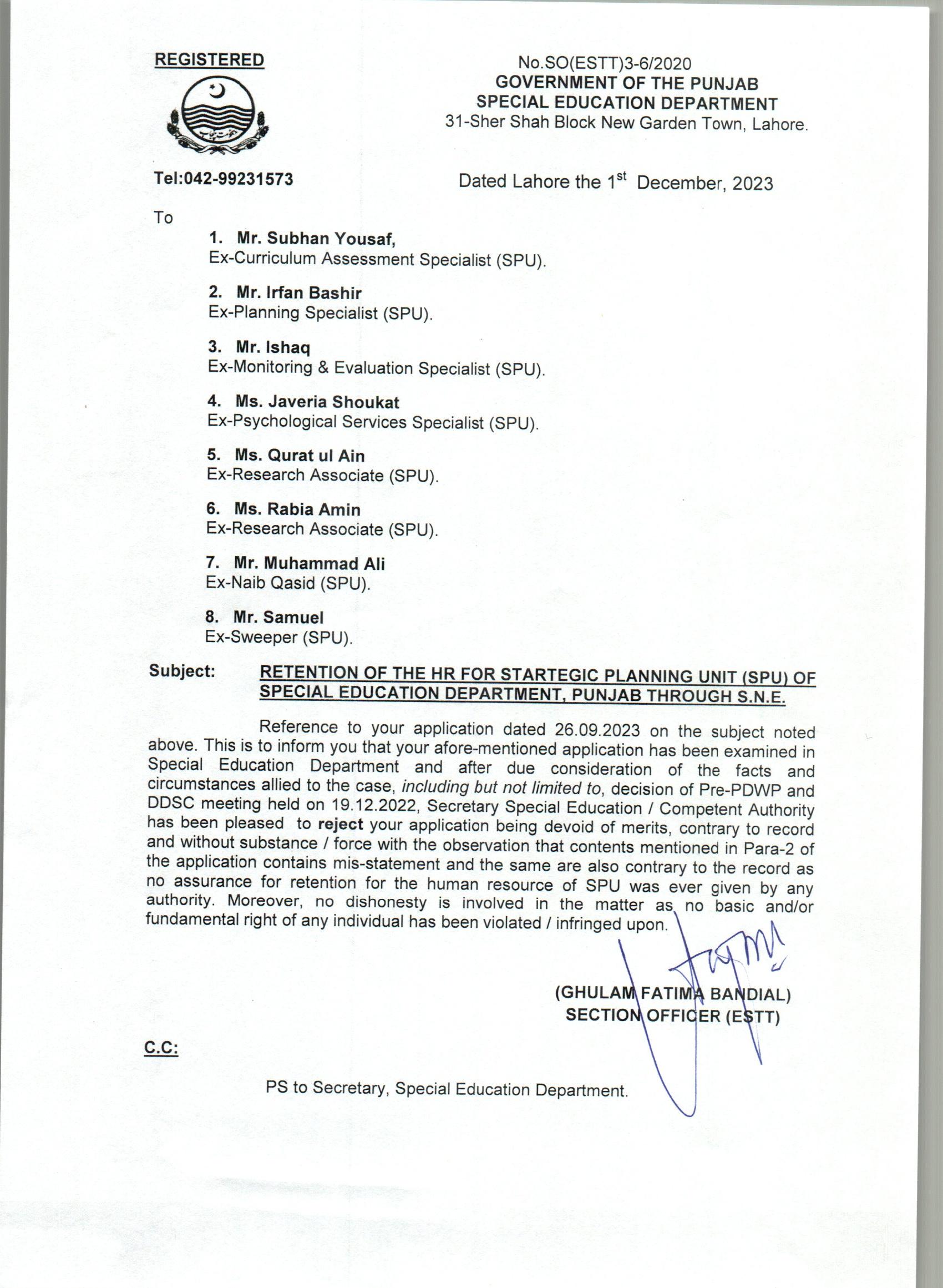 Regret (Request for Retension of the HR for SPU) |